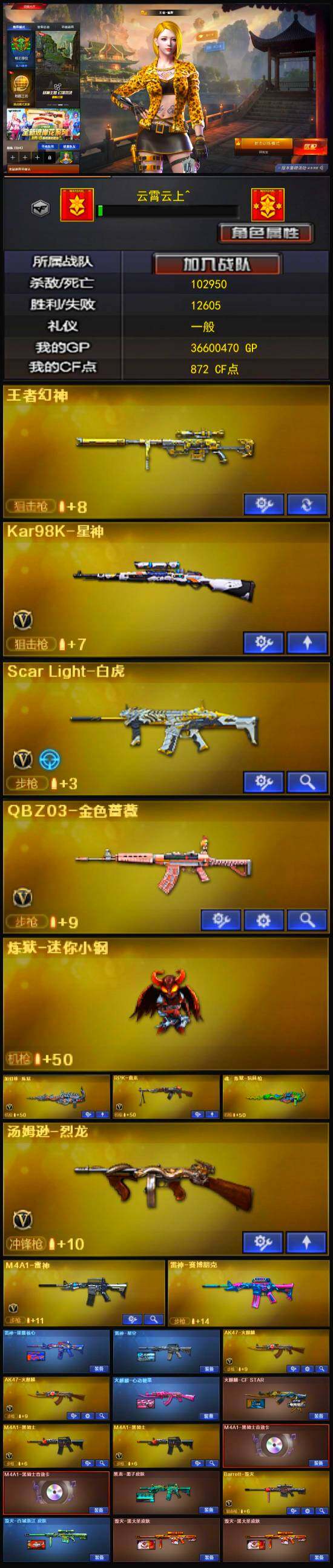 【热门武器】:王者幻神,QBZ03-金色蔷薇,Scar Light-白虎,Kar98K-星神,炼狱-迷你小钢,M4A1-黑骑士*2,汤姆逊-烈龙,RPK-盘龙,加特林-炼狱,沙鹰-修罗*2,金刚伞