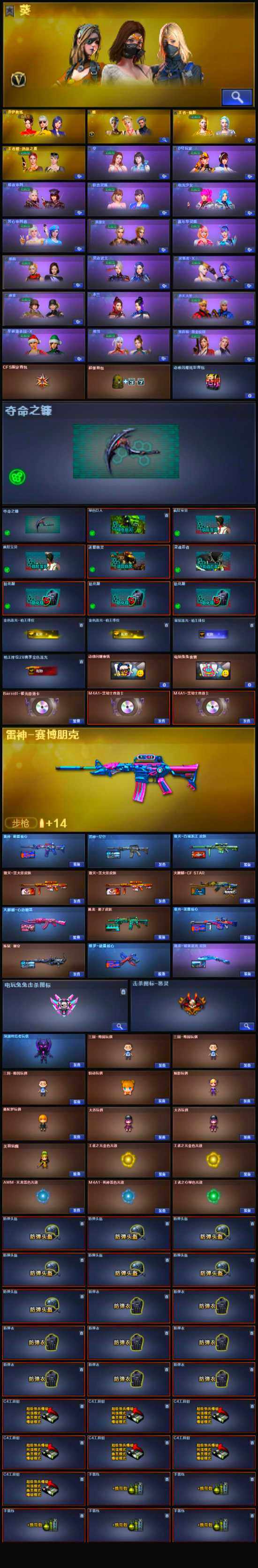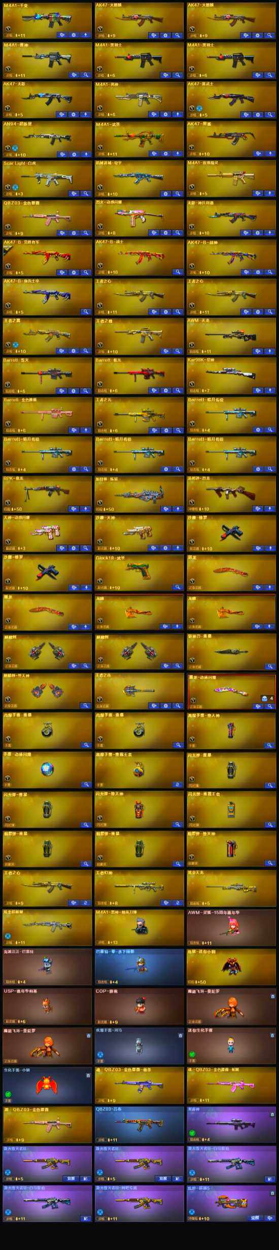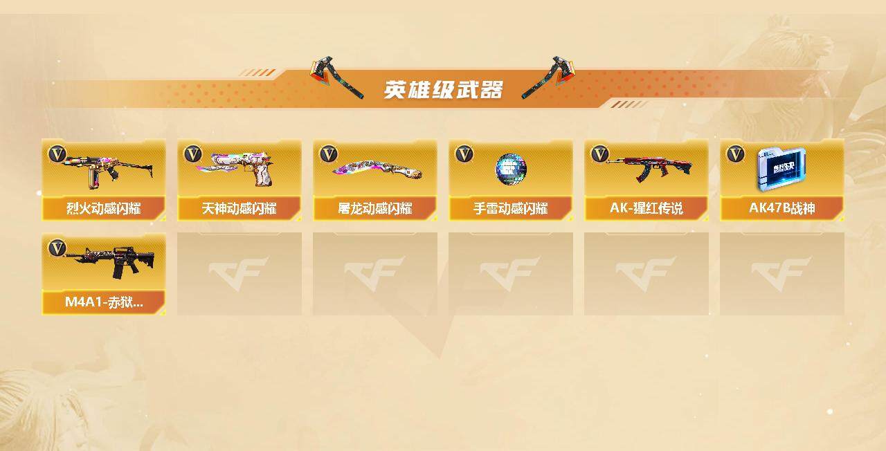 【英雄级武器】:麒麟刺-堕天神,斩神刀-雷暴,M4A1-武圣,Glock18-武圣,烈火-动感闪耀,天神-动感闪耀,屠龙-动感闪耀,手雷-动感闪耀,QBZ03-金色蔷薇,Scar Light-白虎,无影-神兵利器,M4A1-雷神,M4A1-玫瑰精灵,M4A1-黑骑士*2,M4A1-死神,RPK-盘龙,加特林-炼狱,汤姆逊-烈龙,AK47-无影,AK47-火麒麟*2,AK47-黑武士,AN94-超新星,AWM-天龙,Barrett-毁灭,Barrett-极光,Kar98K-星神,AK47-黑鲨,M4A1-千变,AK-47-猩红传说*3,AK47-B-战神,AK47-B-常胜将军,M4A1-赤狱骑士,沙鹰-天神,沙鹰-修罗*2,麒麟刺*2,龙啸*2,屠龙*2