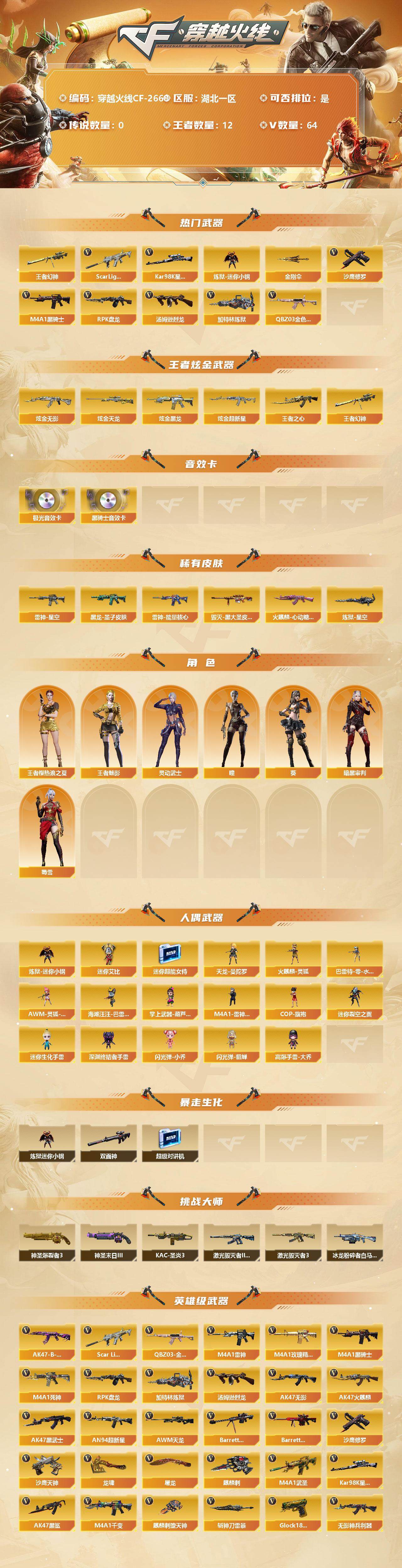 [12308529]【商品标题】:湖北一区-64V-12王者-4炫金 【热门武器】:王者幻神,QBZ03-金色蔷薇,Scar Light-白虎,Kar98K-星神,炼狱-迷你小钢,M4A1-黑骑士*2,汤姆逊-烈龙,RPK-盘龙,加特林-炼狱,沙鹰-修罗*2,金刚伞 【王者炫金武器】:炫金无影,炫金天龙,炫金黑龙,炫金超新星,王者幻神,王者之心 【音效卡】:M4A1-黑骑士音效卡*2,Barrett-极光音效卡 【稀有皮肤】:雷神-能量核心,雷神-星空,火麒麟-心动糖果,黑龙-墨子皮肤,炼狱-星空,毁灭-黑大圣皮肤*2 【角色】:王者樱-热浪之夏,王者-魅影,葵,瞳,蜀雪,灵动武士,暗黑审判 【人偶武器】:天龙-曼陀罗,火麒麟-灵狐,巴雷特-零-水下丽影,AWM-灵狐-15周年嘉年华,海滩汪汪-巴雷特,掌上武器-葫芦兄弟,M4A1-雷神-精英刀锋,COP-旗袍,炼狱-迷你小钢,迷你艾比,迷你超能女侍,迷你裂空之翼,迷你生化手雷,深渊终结者手雷,闪光弹-小乔,闪光弹-貂蝉,高爆手雷-大乔 【暴走生化】:炼狱-迷你小钢,双面神,超级对讲机 【挑战大师】:神圣爆裂者III,神圣爆裂者-末日III*2,KAC-圣炎切割者III,激光毁灭者III*2,激光毁灭者III-白马银枪*2,冰龙粉碎者-白马银枪*2 【英雄级武器】:麒麟刺-堕天神,斩神刀-雷暴,M4A1-武圣,Glock18-武圣,烈火-动感闪耀,天神-动感闪耀,屠龙-动感闪耀,手雷-动感闪耀,QBZ03-金色蔷薇,Scar Light-白虎,无影-神兵利器,M4A1-雷神,M4A1-玫瑰精灵,M4A1-黑骑士*2,M4A1-死神,RPK-盘龙,加特林-炼狱,汤姆逊-烈龙,AK47-无影,AK47-火麒麟*2,AK47-黑武士,AN94-超新星,AWM-天龙,Barrett-毁灭,Barrett-极光,Kar98K-星神,AK47-黑鲨,M4A1-千变,AK-47-猩红传说*3,AK47-B-战神,AK47-B-常胜将军,M4A1-赤狱骑士,沙鹰-天神,沙鹰-修罗*2,麒麟刺*2,龙啸*2,屠龙*2 【特殊枪械】:1白虎,2黑骑士,1烈龙,1盘龙,1炼狱