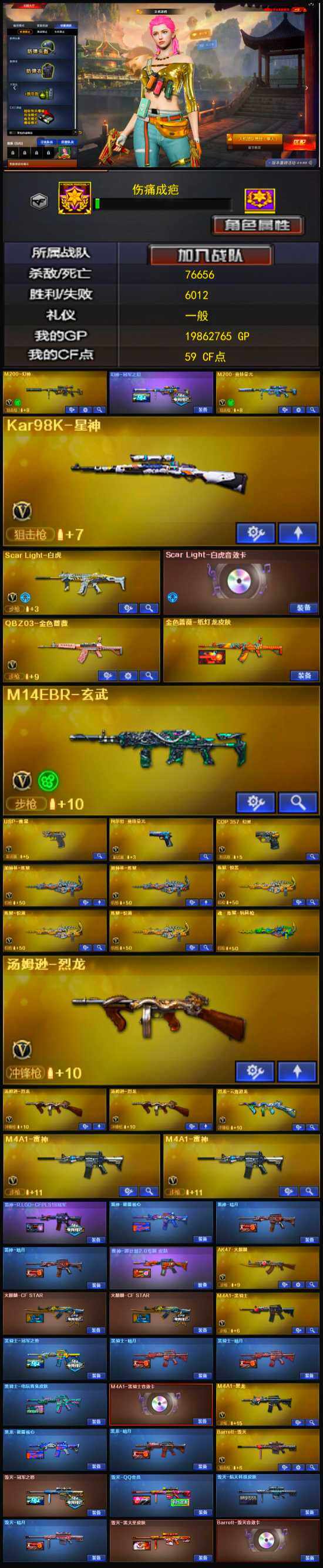 【热门武器】:QBZ03-金色蔷薇,M14EBR-玄武,Scar Light-白虎,M200-幻神,M200-竞技荣光,凤吟之魄,Kar98K-星神,C.A.T,M4A1-黑骑士,汤姆逊-烈龙*3,加特林-炼狱*2,USP-雷暴,COP 357-幻灵,沙鹰-修罗*2