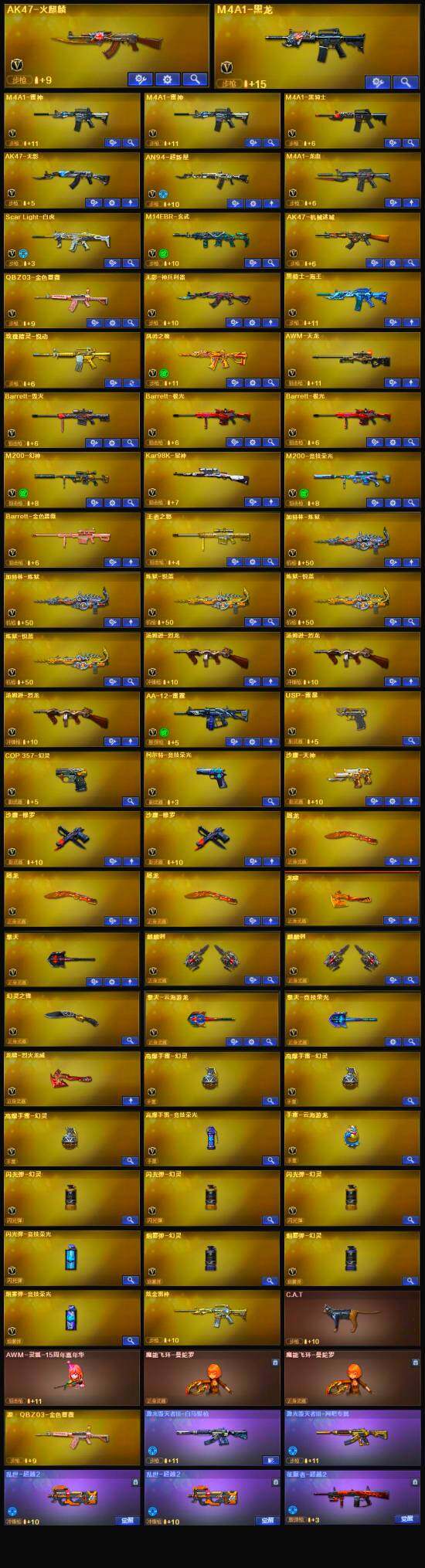 【英雄级武器】:M200-竞技荣光,柯尔特-竞技荣光,擎天-竞技荣光,高爆手雷-竞技荣光,烟雾弹-竞技荣光,闪光弹-竞技荣光,COP 357-幻灵,幻灵之锋,USP-雷暴,QBZ03-金色蔷薇,M14EBR-玄武,Scar Light-白虎,无影-神兵利器,M4A1-雷神*2,M4A1-黑龙,M4A1-黑骑士,加特林-炼狱*2,汤姆逊-烈龙*3,AK47-无影,AK47-火麒麟,AN94-超新星,AWM-天龙,Barrett-毁灭,Barrett-极光*2,M4A1-龙血,AK47-机械迷城,AA-12-雷霆,Kar98K-星神,M200-幻神,黑骑士-海王,M4A1-赤狱骑士,沙鹰-天神,沙鹰-修罗*2,麒麟刺*2,擎天,龙啸,屠龙*3,擎天-云海游龙