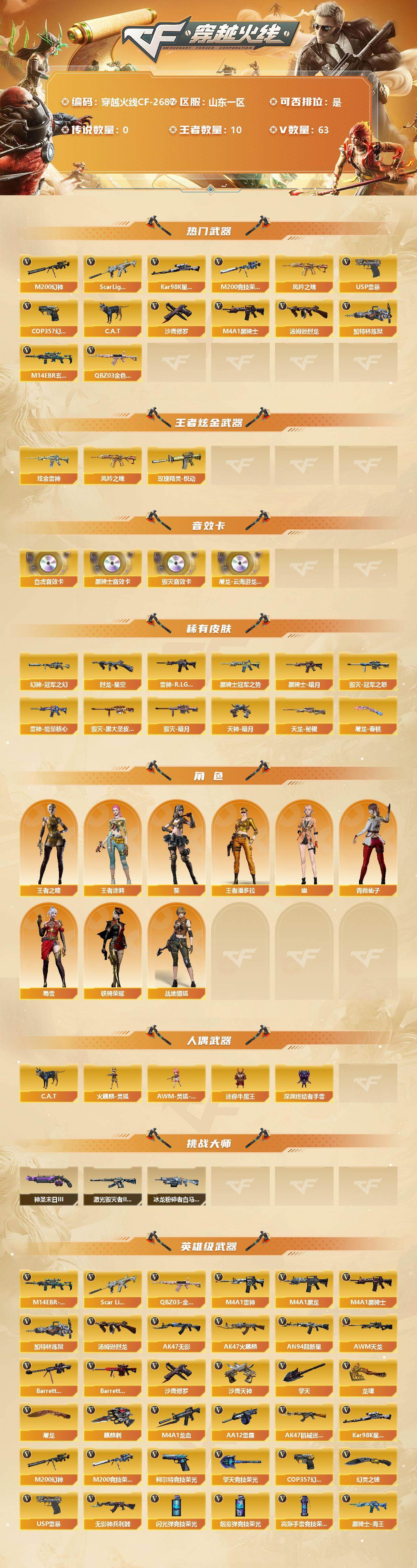 [12308606]【商品标题】:山东一区-63V-10王者-1炫金 【热门武器】:QBZ03-金色蔷薇,M14EBR-玄武,Scar Light-白虎,M200-幻神,M200-竞技荣光,凤吟之魄,Kar98K-星神,C.A.T,M4A1-黑骑士,汤姆逊-烈龙*3,加特林-炼狱*2,USP-雷暴,COP 357-幻灵,沙鹰-修罗*2 【王者炫金武器】:炫金雷神,玫瑰精灵-悦动,凤吟之魄 【音效卡】:屠龙-云海游龙音效卡,M4A1-黑骑士音效卡,Barrett-毁灭音效卡,Scar Light-白虎音效卡 【稀有皮肤】:幻神-冠军之幻,雷神-能量核心,雷神-R.LGD-CFPLS18冠军,黑骑士-暗月*2,黑骑士-冠军之势,毁灭-暗月,毁灭-冠军之怒,毁灭-黑大圣皮肤,天龙-秘银,烈龙-星空,天神-暗月*3,屠龙-春桃 皮肤 【角色】:王者之瞳,王者涂鸦,王者潘多拉,葵,幽,战地猎狐,蜀雪,铁骑荣耀,青霞仙子 【人偶武器】:火麒麟-灵狐,AWM-灵狐-15周年嘉年华,C.A.T,迷你牛魔王,深渊终结者手雷 【挑战大师】:神圣爆裂者-末日III,激光毁灭者III-白马银枪,冰龙粉碎者-白马银枪 【英雄级武器】:M200-竞技荣光,柯尔特-竞技荣光,擎天-竞技荣光,高爆手雷-竞技荣光,烟雾弹-竞技荣光,闪光弹-竞技荣光,COP 357-幻灵,幻灵之锋,USP-雷暴,QBZ03-金色蔷薇,M14EBR-玄武,Scar Light-白虎,无影-神兵利器,M4A1-雷神*2,M4A1-黑龙,M4A1-黑骑士,加特林-炼狱*2,汤姆逊-烈龙*3,AK47-无影,AK47-火麒麟,AN94-超新星,AWM-天龙,Barrett-毁灭,Barrett-极光*2,M4A1-龙血,AK47-机械迷城,AA-12-雷霆,Kar98K-星神,M200-幻神,黑骑士-海王,M4A1-赤狱骑士,沙鹰-天神,沙鹰-修罗*2,麒麟刺*2,擎天,龙啸,屠龙*3,擎天-云海游龙 【特殊枪械】:1白虎,1黑骑士,3烈龙,2炼狱