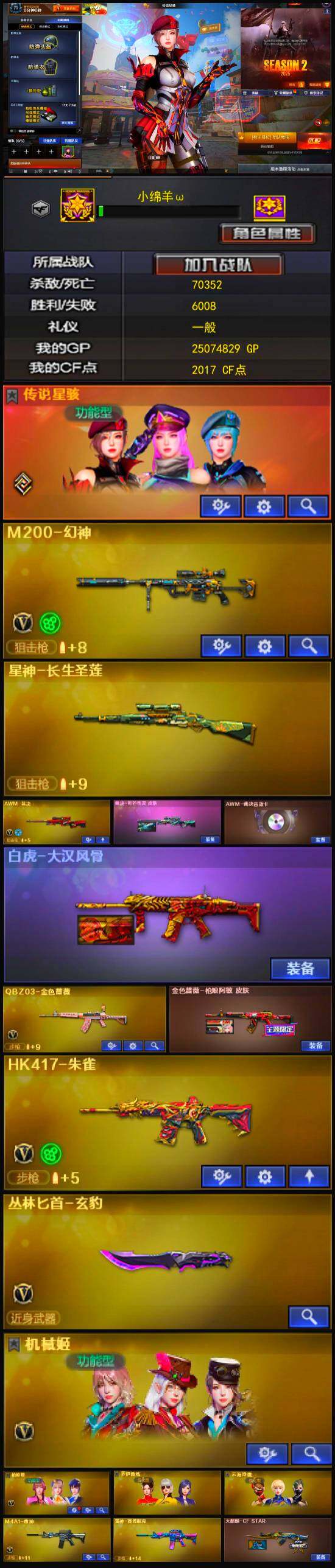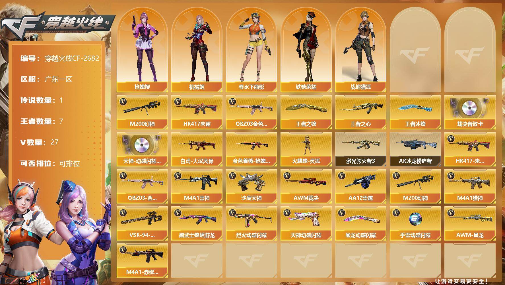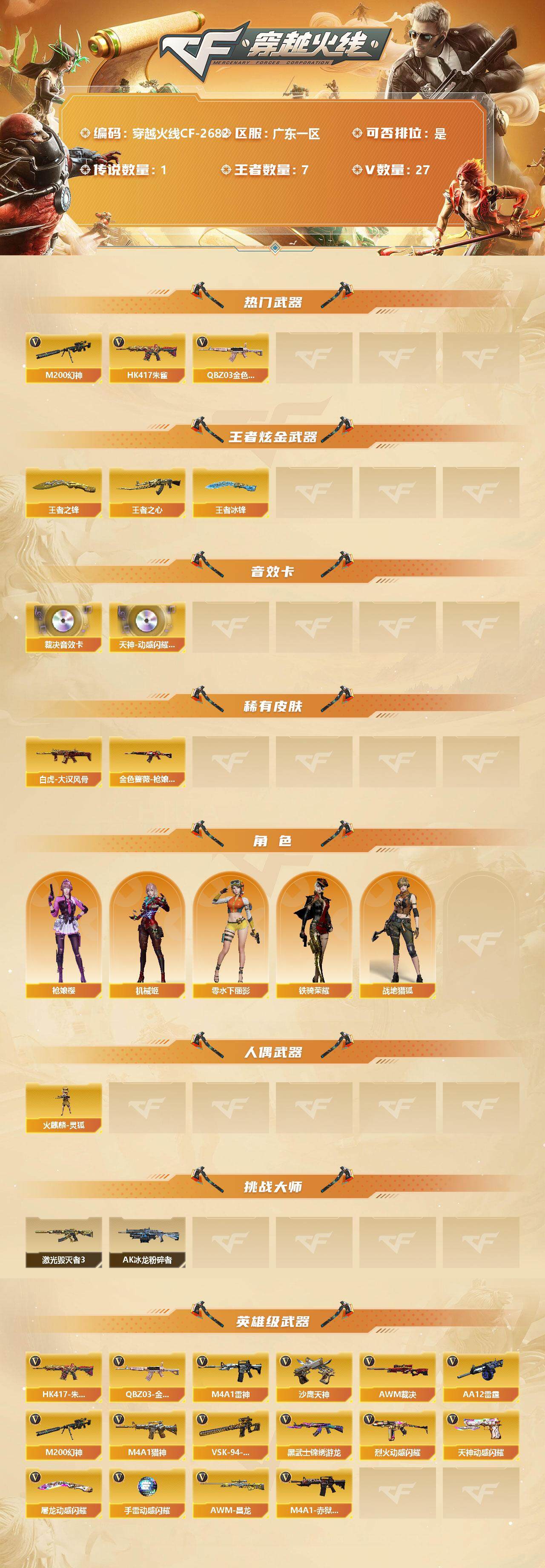 [12308578]【商品标题】:广东一区-27V-7王者-0炫金 【传说角色】:传说星骇 【热门武器】:QBZ03-金色蔷薇,HK417-朱雀,M200-幻神 【王者炫金武器】:王者之心,王者之锋,王者冰锋 【音效卡】:天神-动感闪耀 音效卡,AWM-裁决音效卡 【稀有皮肤】:白虎-大汉风骨,金色蔷薇-枪娘阿敏 皮肤 【角色】:零-水下丽影,枪娘樱,机械姬,战地猎狐,铁骑荣耀 【人偶武器】:火麒麟-灵狐 【挑战大师】:激光毁灭者III,AK47-冰龙粉碎者 【英雄级武器】:烈火-动感闪耀,天神-动感闪耀,屠龙-动感闪耀,手雷-动感闪耀,QBZ03-金色蔷薇,HK417-朱雀,M4A1-雷神,AWM-裁决,AA-12-雷霆,M200-幻神,M4A1-猎神,VSK-94-金蚀,黑武士-锦绣游龙,AWM-昌龙,M4A1-赤狱骑士,沙鹰-天神*2 【特殊枪械】: