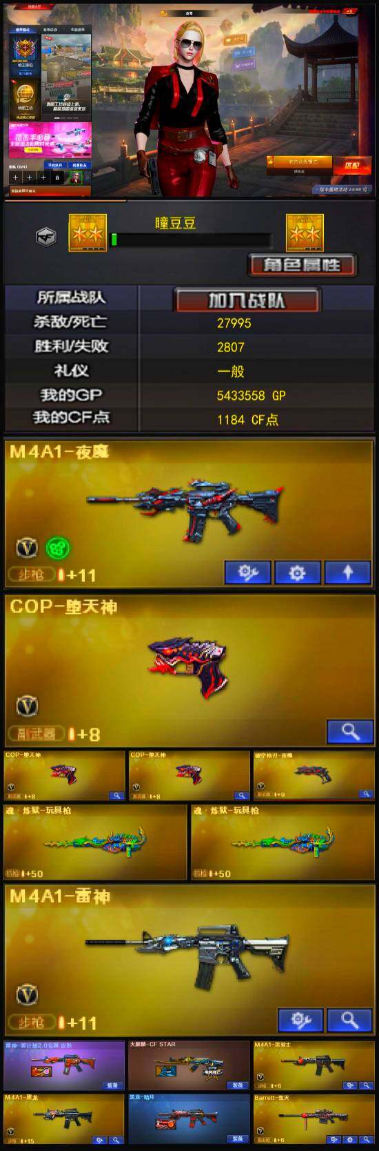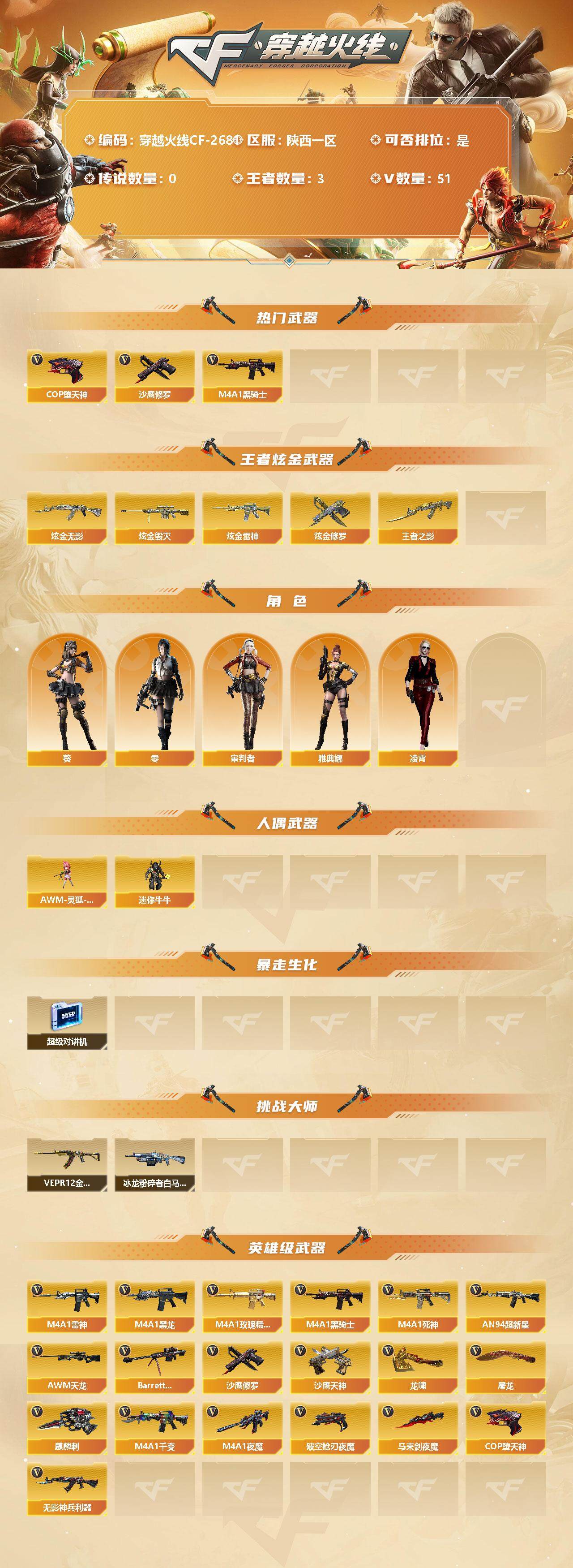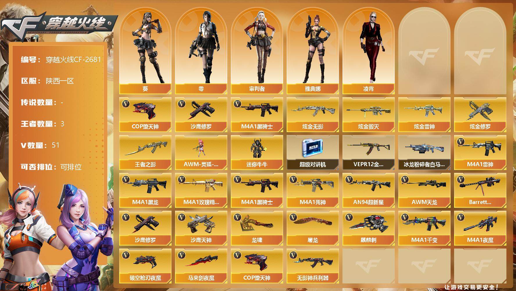 [12308575]【商品标题】:陕西一区-51V-3王者-4炫金 【热门武器】:M4A1-黑骑士,COP-堕天神*3,沙鹰-修罗 【王者炫金武器】:炫金无影,炫金毁灭,炫金雷神,炫金修罗,王者之影 【角色】:雅典娜,审判者,零,葵,凌霄 【人偶武器】:AWM-灵狐-15周年嘉年华,迷你牛牛 【暴走生化】:超级对讲机 【挑战大师】:VEPR-12-金魔*3,冰龙粉碎者-白马银枪 【英雄级武器】:M4A1-夜魔,破空枪刃-夜魔,马来剑-夜魔,COP-堕天神*3,无影-神兵利器,M4A1-雷神,M4A1-黑龙,M4A1-玫瑰精灵,M4A1-黑骑士,M4A1-死神,AN94-超新星,AWM-天龙,Barrett-毁灭,M4A1-千变,沙鹰-天神,沙鹰-修罗,麒麟刺,龙啸,屠龙 【特殊枪械】:1黑骑士