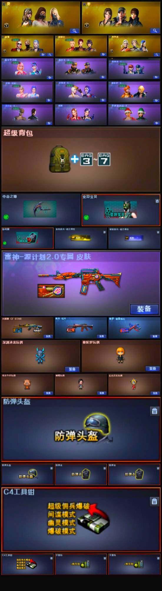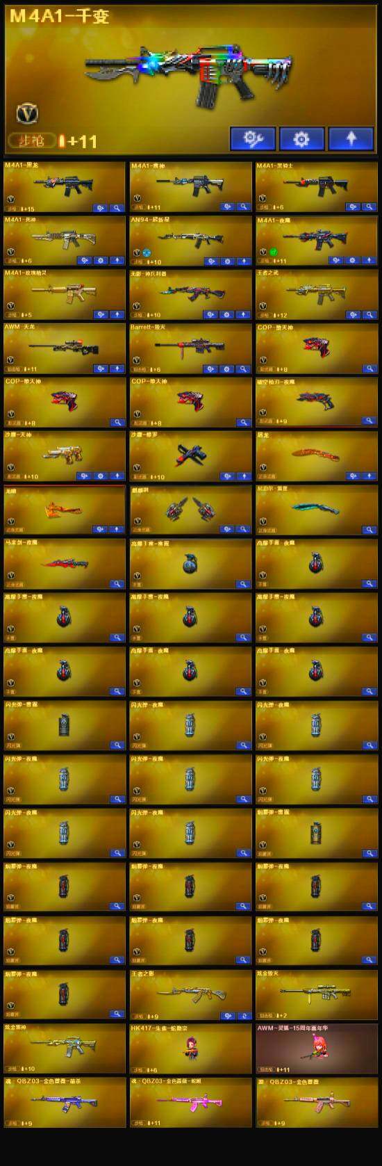 【英雄级武器】:M4A1-夜魔,破空枪刃-夜魔,马来剑-夜魔,COP-堕天神*3,无影-神兵利器,M4A1-雷神,M4A1-黑龙,M4A1-玫瑰精灵,M4A1-黑骑士,M4A1-死神,AN94-超新星,AWM-天龙,Barrett-毁灭,M4A1-千变,沙鹰-天神,沙鹰-修罗,麒麟刺,龙啸,屠龙