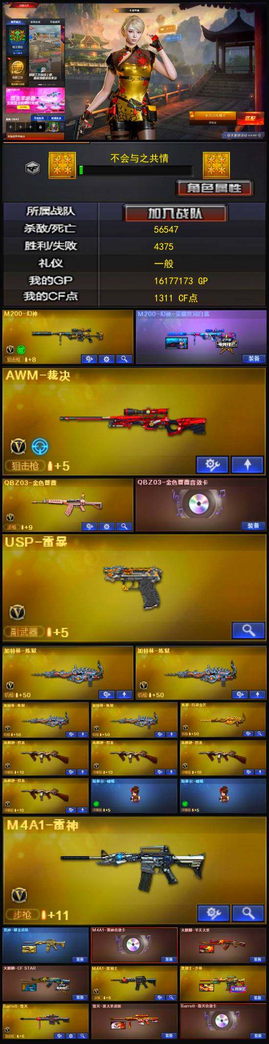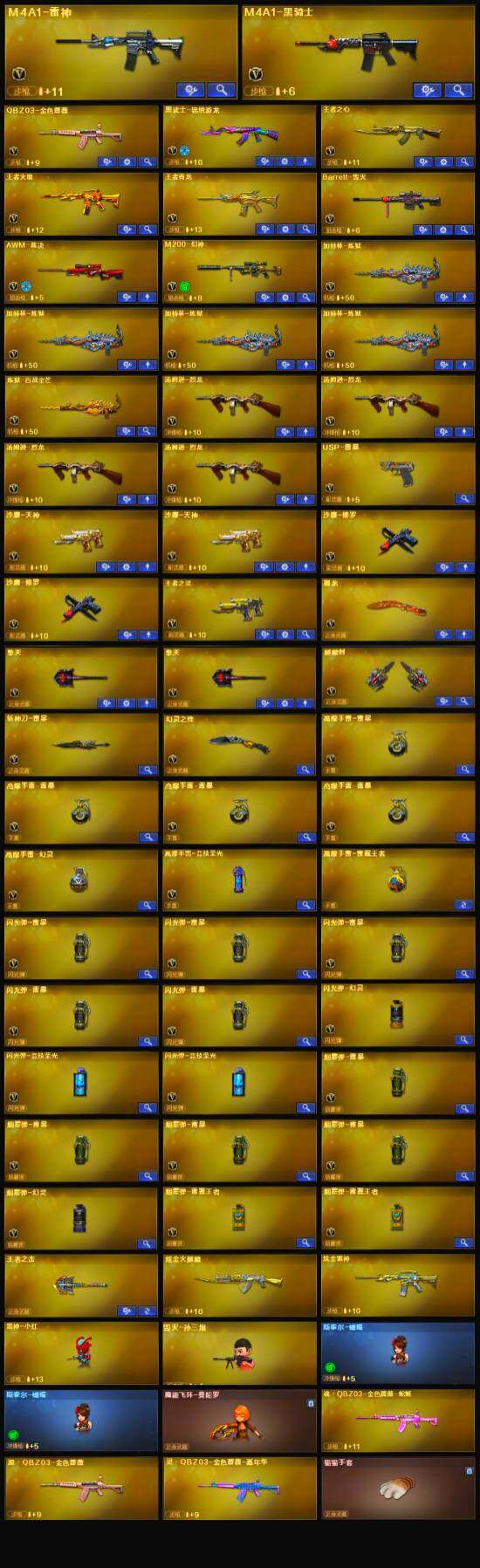 【英雄级武器】:高爆手雷-竞技荣光,闪光弹-竞技荣光*2,幻灵之锋,USP-雷暴,斩神刀-雷暴,QBZ03-金色蔷薇,M4A1-雷神,M4A1-黑骑士,加特林-炼狱*4,汤姆逊-烈龙*4,Barrett-毁灭,AWM-裁决,M200-幻神,黑武士-锦绣游龙,M4A1-赤狱骑士,沙鹰-天神*2,沙鹰-修罗*2,麒麟刺,擎天*2,屠龙