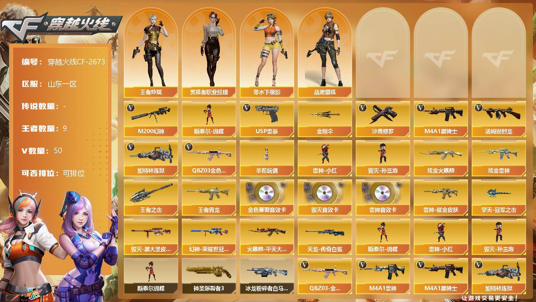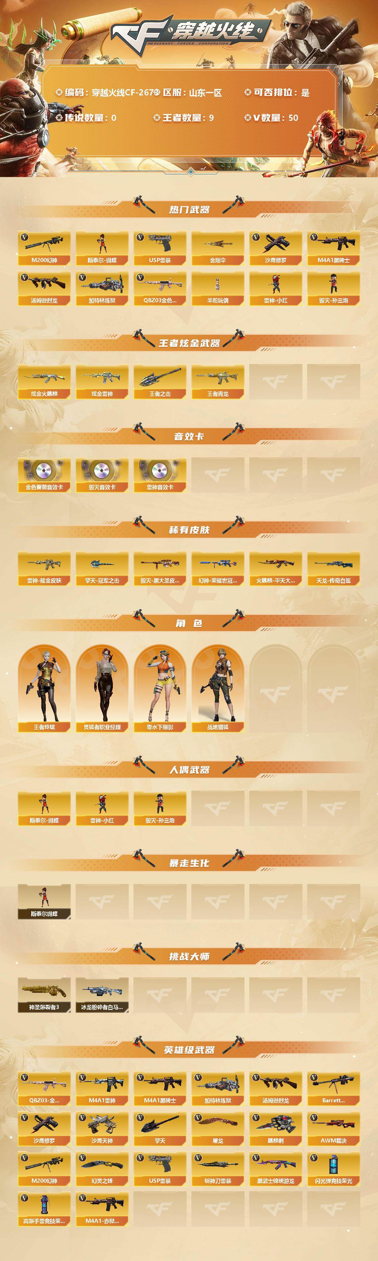 [12308539]【商品标题】:山东一区-50V-9王者-2炫金 【热门武器】:QBZ03-金色蔷薇,M200-幻神,M4A1-黑骑士,汤姆逊-烈龙*4,加特林-炼狱*4,斯泰尔-蝴蝶*2,羊驼玩偶,雷神-小红,毁灭-孙三炮,USP-雷暴,沙鹰-修罗*2,金刚伞*2 【王者炫金武器】:炫金火麒麟,炫金雷神,王者青龙,王者之击 【音效卡】:M4A1-雷神音效卡,Barrett-毁灭音效卡,QBZ03-金色蔷薇音效卡 【稀有皮肤】:M200-幻神-荣耀世冠白鲨,雷神-耀金皮肤,火麒麟-平天大圣,毁灭-黑大圣皮肤,AWM-天龙-传奇白鲨*2,擎天-冠军之击 【角色】:王者玲珑,零-水下丽影,灵狐者-职业经理,战地猎狐 【人偶武器】:雷神-小红,毁灭-孙三炮,斯泰尔-蝴蝶*2 【暴走生化】:斯泰尔-蝴蝶*2 【挑战大师】:神圣爆裂者III,冰龙粉碎者-白马银枪 【英雄级武器】:高爆手雷-竞技荣光,闪光弹-竞技荣光*2,幻灵之锋,USP-雷暴,斩神刀-雷暴,QBZ03-金色蔷薇,M4A1-雷神,M4A1-黑骑士,加特林-炼狱*4,汤姆逊-烈龙*4,Barrett-毁灭,AWM-裁决,M200-幻神,黑武士-锦绣游龙,M4A1-赤狱骑士,沙鹰-天神*2,沙鹰-修罗*2,麒麟刺,擎天*2,屠龙 【特殊枪械】:蝴蝶斯泰尔+4烈龙,1黑骑士,4烈龙,4炼狱,2蝴蝶斯泰尔