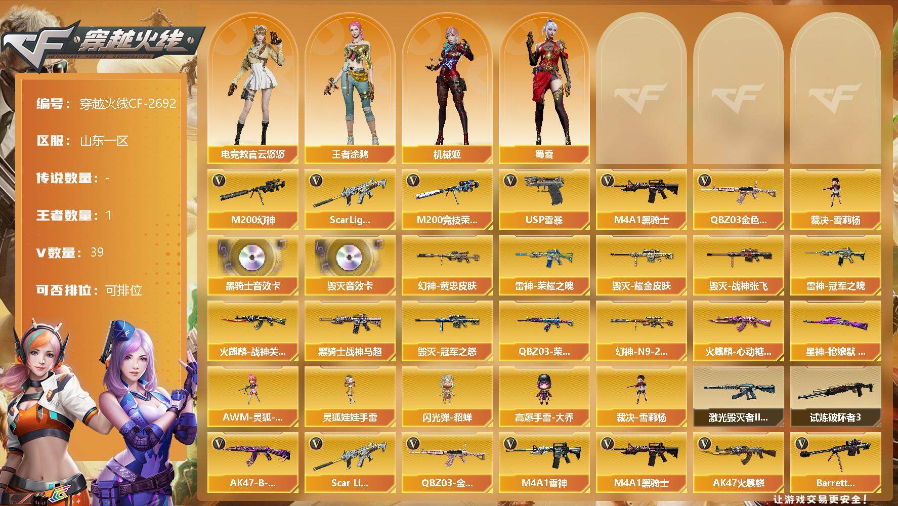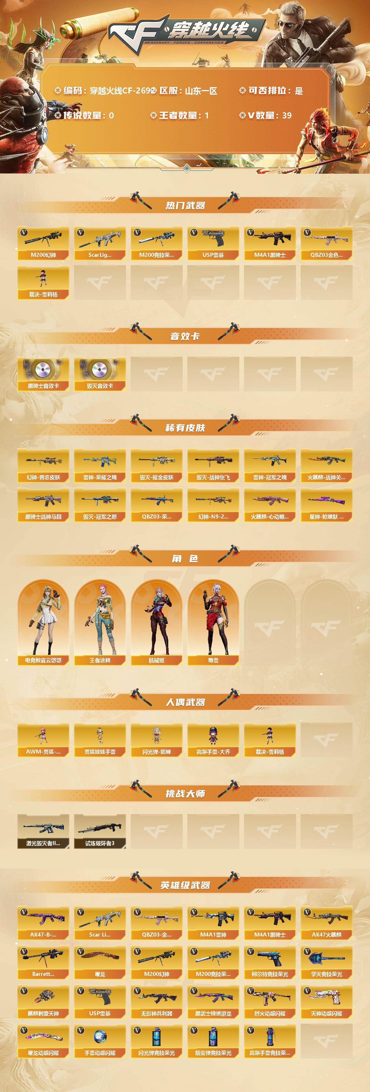 [12308633]【商品标题】:山东一区-39V-1王者-0炫金 【热门武器】:QBZ03-金色蔷薇,Scar Light-白虎,M200-幻神,M200-竞技荣光,M4A1-黑骑士,裁决-雪莉杨,USP-雷暴 【音效卡】:M4A1-黑骑士音效卡,Barrett-毁灭音效卡 【稀有皮肤】:M200-幻神-黄忠皮肤,M200-幻神-N9-2022MVP,星神-枪娘默 皮肤,QBZ03-荣耀世冠白鲨,雷神-荣耀之魄,雷神-冠军之魄,火麒麟-战神关羽,火麒麟-心动糖果,黑骑士-战神马超,毁灭耀金皮肤,毁灭-冠军之怒,毁灭-战神张飞 【角色】:王者涂鸦,电竞教官-云悠悠,机械姬,蜀雪 【人偶武器】:裁决-雪莉杨,AWM-灵狐-15周年嘉年华,灵狐娃娃手雷,闪光弹-貂蝉,高爆手雷-大乔 【挑战大师】:试炼破坏者III,激光毁灭者III-白马银枪 【英雄级武器】:M200-竞技荣光,柯尔特-竞技荣光,擎天-竞技荣光,高爆手雷-竞技荣光*2,烟雾弹-竞技荣光*2,闪光弹-竞技荣光*3,麒麟刺-堕天神*2,USP-雷暴,烈火-动感闪耀,天神-动感闪耀,屠龙-动感闪耀,手雷-动感闪耀,QBZ03-金色蔷薇,Scar Light-白虎,无影-神兵利器,M4A1-雷神,M4A1-黑骑士,AK47-火麒麟*2,Barrett-毁灭,M200-幻神,黑武士-锦绣游龙,AK47-B-常胜将军,屠龙 【特殊枪械】:1白虎,1黑骑士