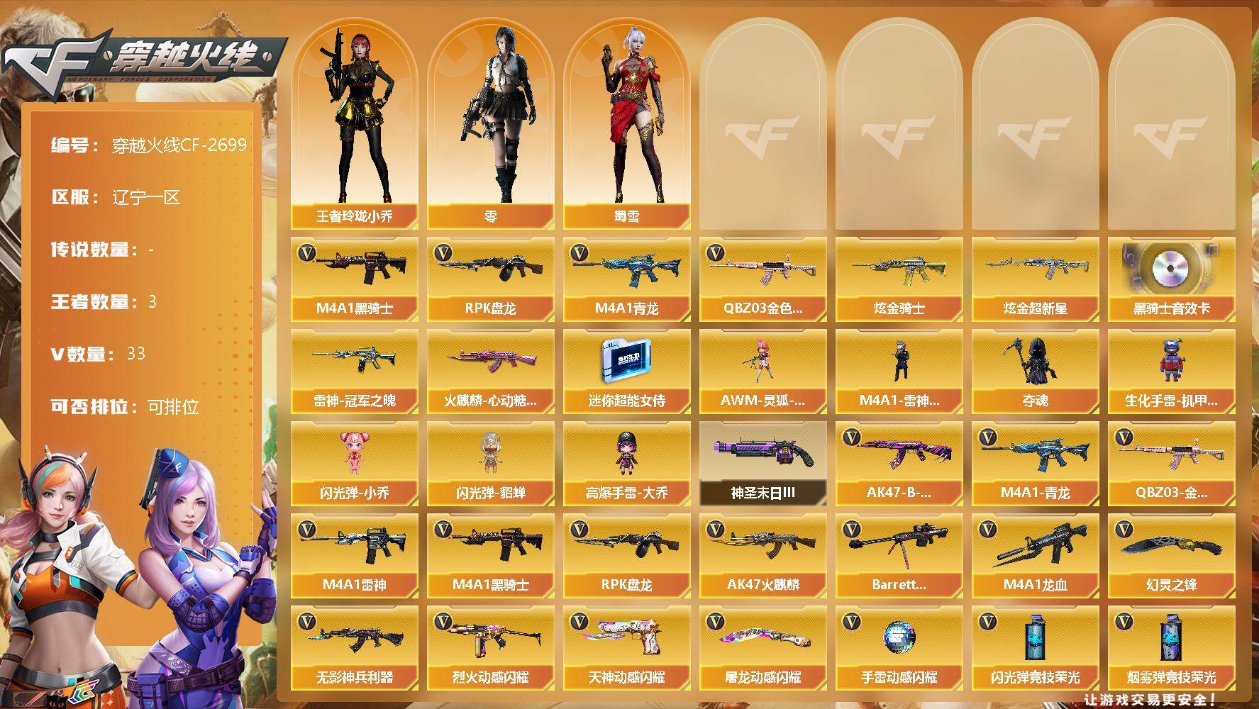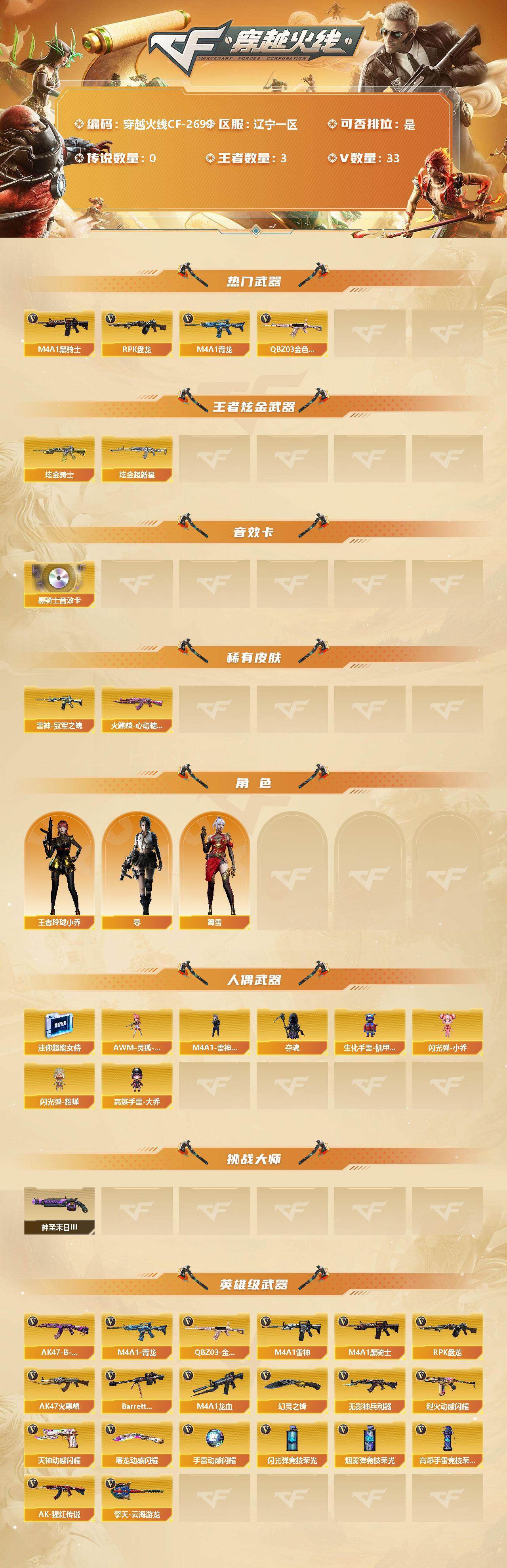 [12308697]【商品标题】:辽宁一区-33V-3王者-2炫金 【热门武器】:QBZ03-金色蔷薇,M4A1-青龙,M4A1-黑骑士,RPK-盘龙 【王者炫金武器】:炫金骑士,炫金超新星 【音效卡】:M4A1-黑骑士音效卡 【稀有皮肤】:雷神-冠军之魄,火麒麟-心动糖果 【角色】:王者玲珑-小乔,零,蜀雪 【人偶武器】:AWM-灵狐-15周年嘉年华,M4A1-雷神-精英刀锋,迷你超能女侍,夺魂,生化手雷-机甲核心,闪光弹-小乔,闪光弹-貂蝉,高爆手雷-大乔 【挑战大师】:神圣爆裂者-末日III 【英雄级武器】:高爆手雷-竞技荣光,烟雾弹-竞技荣光*2,闪光弹-竞技荣光*2,幻灵之锋,烈火-动感闪耀,天神-动感闪耀,屠龙-动感闪耀,手雷-动感闪耀,QBZ03-金色蔷薇,M4A1-青龙,无影-神兵利器,M4A1-雷神,M4A1-黑骑士,RPK-盘龙,AK47-火麒麟*2,Barrett-毁灭,M4A1-龙血*2,AK-47-猩红传说,AK47-B-常胜将军,擎天-云海游龙 【特殊枪械】:1黑骑士,1盘龙