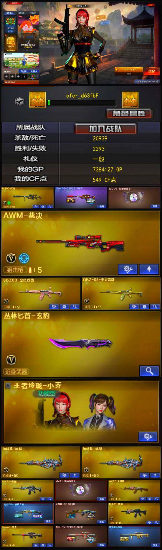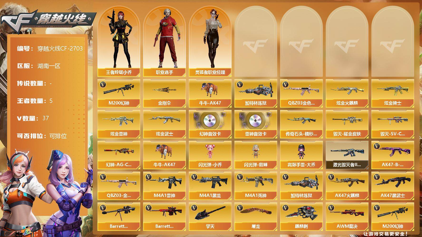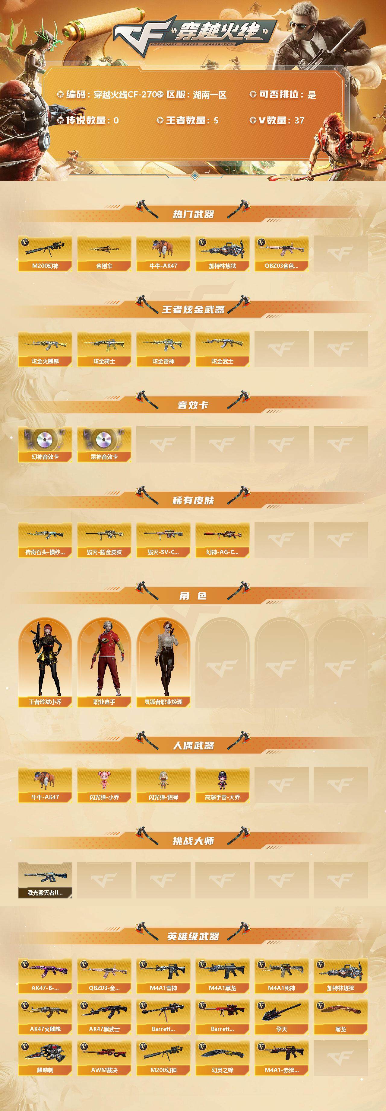 [12308712]【商品标题】:湖南一区-37V-5王者-4炫金 【热门武器】:QBZ03-金色蔷薇,M200-幻神,牛牛-AK47,加特林-炼狱*2,金刚伞 【王者炫金武器】:炫金火麒麟,炫金骑士,炫金雷神,炫金武士 【音效卡】:M200-幻神音效卡,M4A1-雷神音效卡 【稀有皮肤】:幻神-AG-CFPLS17冠军,传奇石头-横秒之巅,毁灭耀金皮肤,毁灭-SV-CFPLS16冠军 【角色】:王者玲珑-小乔,灵狐者-职业经理,职业选手 【人偶武器】:牛牛-AK47,闪光弹-小乔,闪光弹-貂蝉,高爆手雷-大乔 【挑战大师】:激光毁灭者III-白马银枪 【英雄级武器】:幻灵之锋*2,QBZ03-金色蔷薇,M4A1-雷神,M4A1-黑龙,M4A1-死神,加特林-炼狱*2,AK47-火麒麟,AK47-黑武士,Barrett-毁灭,Barrett-极光,AWM-裁决,M200-幻神,AK47-B-常胜将军,M4A1-赤狱骑士,麒麟刺,擎天*2,屠龙*3 【特殊枪械】:2炼狱