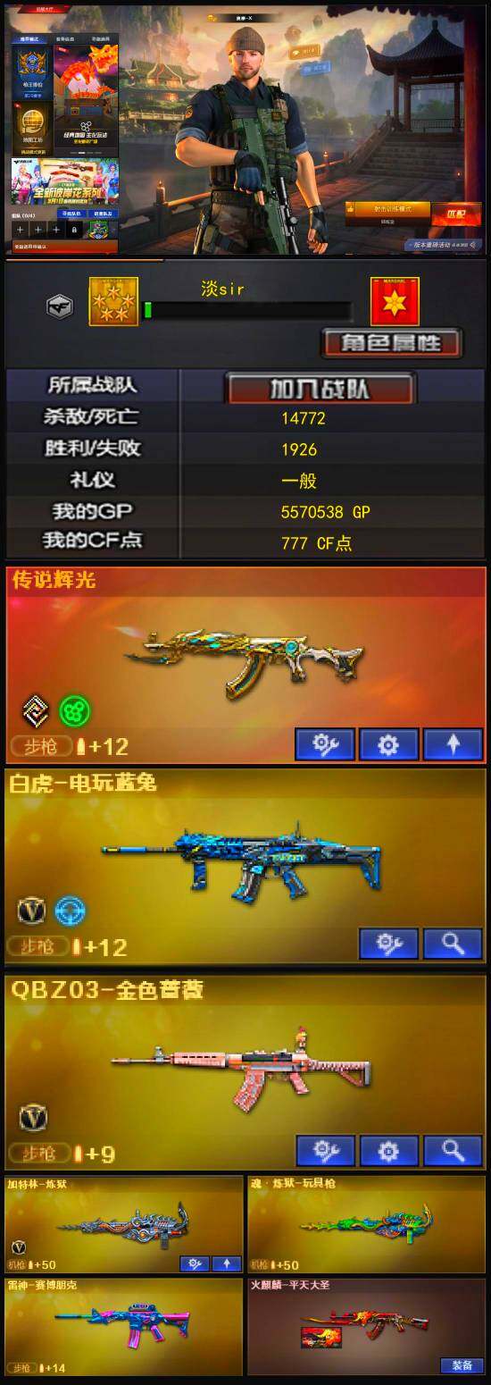 【热门武器】:传说辉光,QBZ03-金色蔷薇,白虎-电玩蓝兔,加特林-炼狱,裁决-雪莉杨