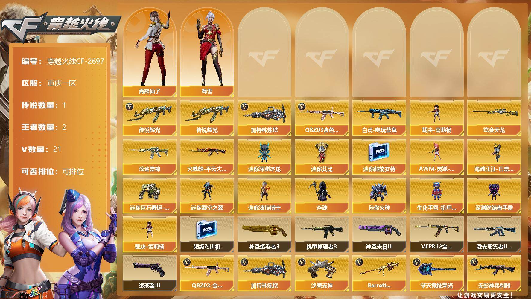 [12308675]【商品标题】:重庆一区-21V-2王者-2炫金 【传说武器】:传说辉光 【热门武器】:传说辉光,QBZ03-金色蔷薇,白虎-电玩蓝兔,加特林-炼狱,裁决-雪莉杨 【王者炫金武器】:炫金天龙,炫金雷神 【稀有皮肤】:火麒麟-平天大圣 【角色】:蜀雪,青霞仙子 【人偶武器】:裁决-雪莉杨,AWM-灵狐-15周年嘉年华,海滩汪汪-巴雷特,迷你深渊冰龙,迷你艾比,迷你超能女侍,迷你巨石泰坦-魔花研究所,迷你裂空之翼,迷你波特博士*3,夺魂*2,迷你火种*2,生化手雷-机甲核心,深渊终结者手雷*2 【暴走生化】:超级对讲机 【挑战大师】:神圣爆裂者III,机甲撕裂者III,神圣爆裂者-末日III,惩戒者III,VEPR-12-金魔,激光毁灭者III-白马银枪 【英雄级武器】:擎天-竞技荣光,高爆手雷-竞技荣光*2,烟雾弹-竞技荣光*2,闪光弹-竞技荣光*2,QBZ03-金色蔷薇,白虎-电玩蓝兔,无影-神兵利器,加特林-炼狱,Barrett-朱雀,AK-47-猩红传说*4,沙鹰-天神 【特殊枪械】:1炼狱