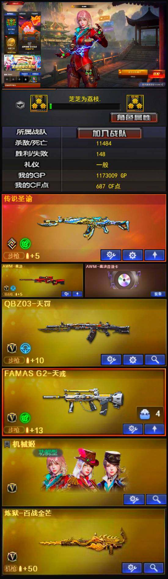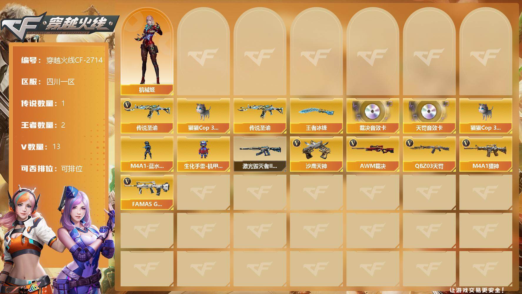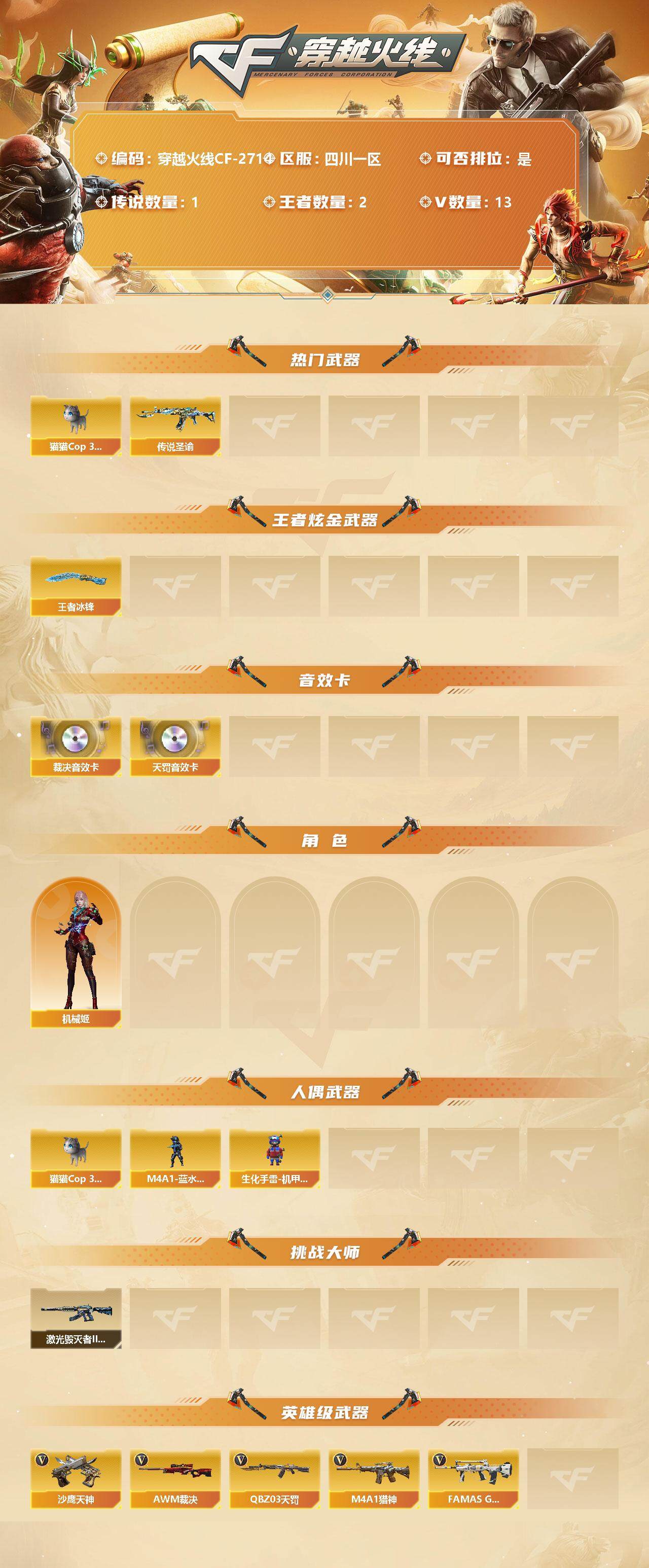 [12308740]【商品标题】:四川一区-13V-2王者-0炫金 【传说武器】:传说圣谕 【热门武器】:传说圣谕,猫猫Cop 357 【王者炫金武器】:王者冰锋 【音效卡】:AWM-裁决音效卡,QBZ03-天罚音效卡 【角色】:机械姬 【人偶武器】:M4A1-蓝水晶-斯沃特精英,猫猫Cop 357,生化手雷-机甲核心 【挑战大师】:激光毁灭者III-白马银枪 【英雄级武器】:FAMAS G2-天戎,AWM-裁决,QBZ03-天罚,M4A1-猎神,沙鹰-天神*3 【特殊枪械】: