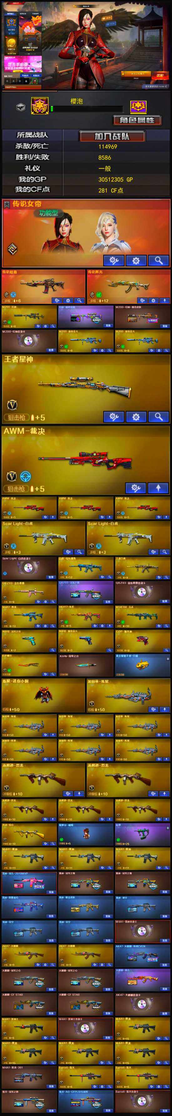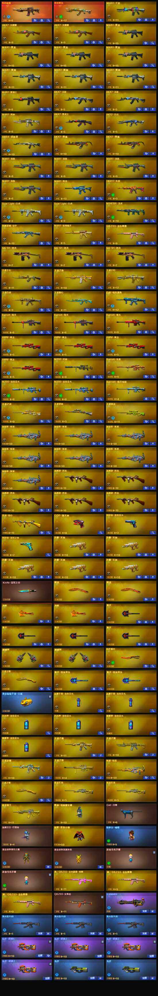 【热门武器】:传说暗裔,传说辉光,QBZ03-金色蔷薇,M14EBR-玄武,Scar Light-白虎*2,HK417-朱雀,M4A1-青龙,M200-幻神,M200-竞技荣光*2,白虎-电玩蓝兔,柯尔特-冠军之特,金色小号,Cat-刀锋,炼狱-迷你小钢,毒蜂,M4A1-黑骑士,汤姆逊-烈龙*5,加特林-炼狱*7,斯泰尔-蝴蝶,羊驼玩偶,COP-白鲨,COP-堕天神,Knife-冠军之刃,炽芒蝶刃,黄金猫猫手套-白鲨