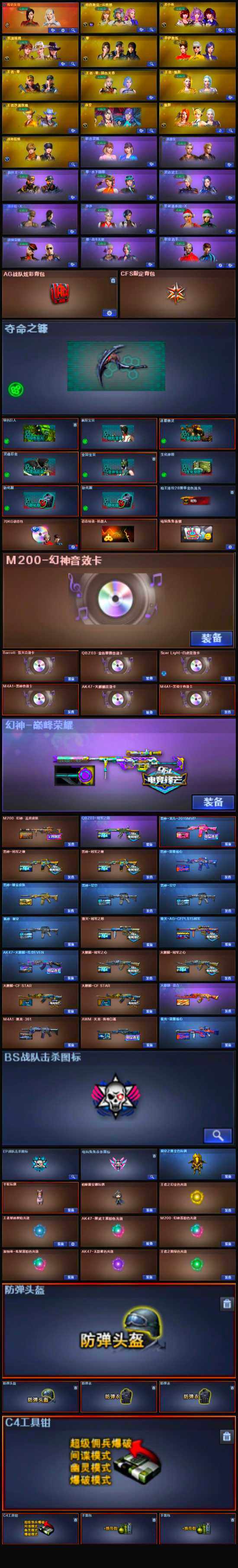 【音效卡】:M200-幻神音效卡,AK47-火麒麟音效卡,M4A1-雷神音效卡,M4A1-黑骑士音效卡,Barrett-毁灭音效卡,QBZ03-金色蔷薇音效卡,Scar Light-白虎音效卡,70KG语音包
