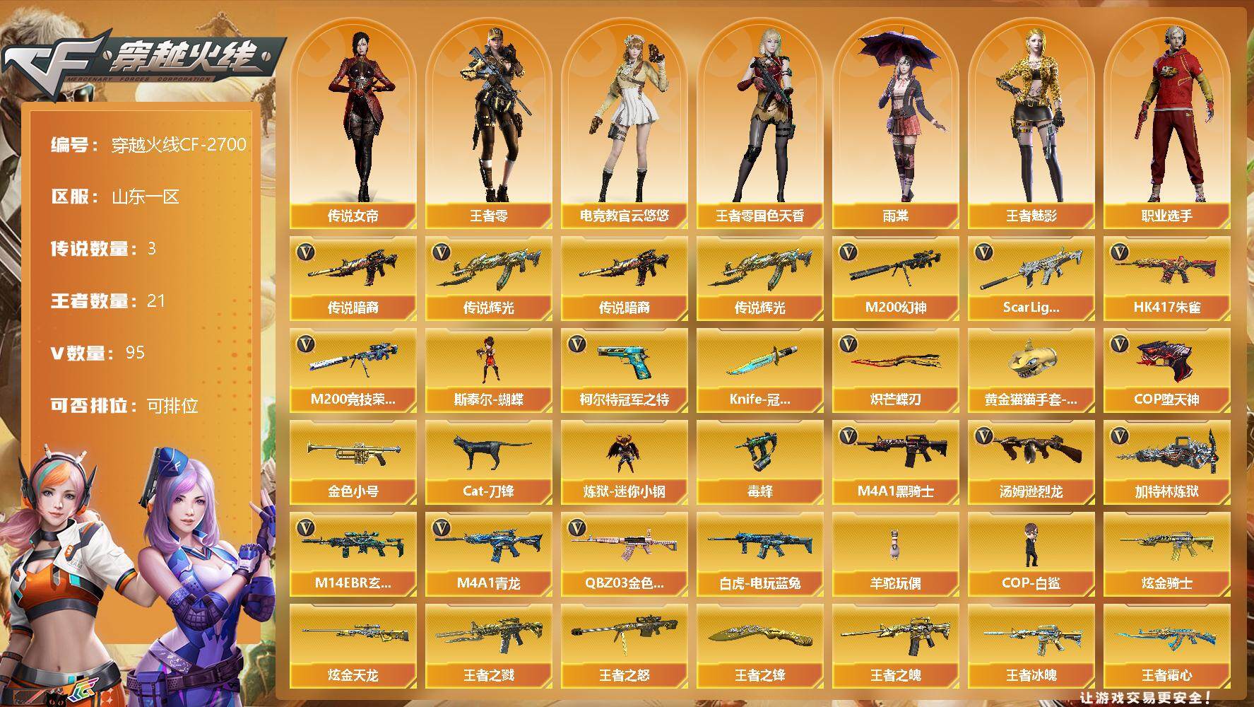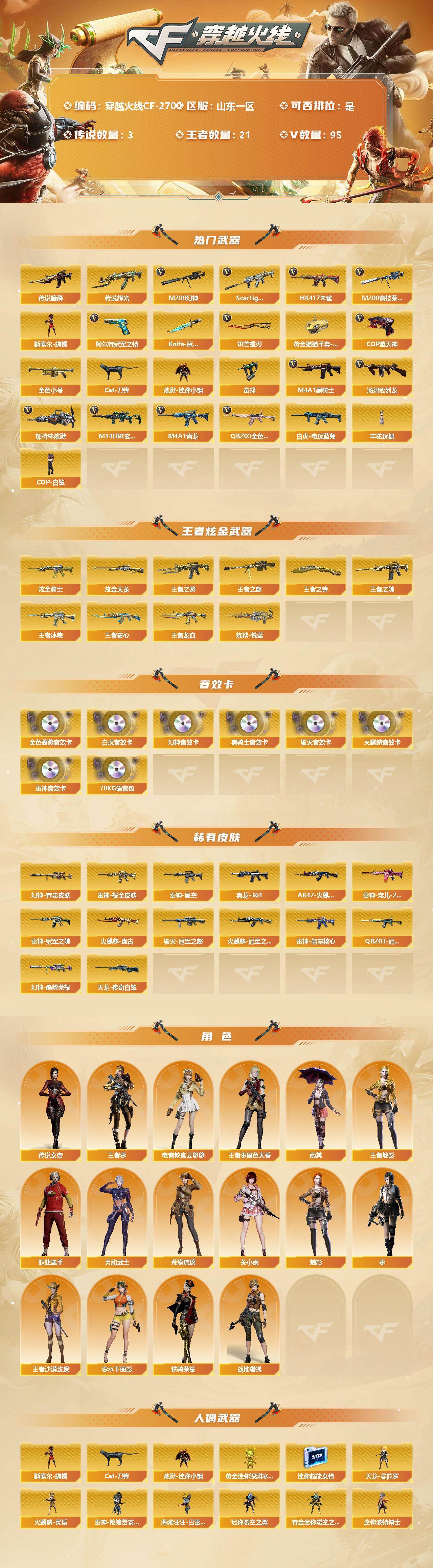 [12308699]【商品标题】:山东一区-95V-21王者-3炫金 【传说武器】:传说暗裔,传说辉光 【传说角色】:传说女帝 【热门武器】:传说暗裔,传说辉光,QBZ03-金色蔷薇,M14EBR-玄武,Scar Light-白虎*2,HK417-朱雀,M4A1-青龙,M200-幻神,M200-竞技荣光*2,白虎-电玩蓝兔,柯尔特-冠军之特,金色小号,Cat-刀锋,炼狱-迷你小钢,毒蜂,M4A1-黑骑士,汤姆逊-烈龙*5,加特林-炼狱*7,斯泰尔-蝴蝶,羊驼玩偶,COP-白鲨,COP-堕天神,Knife-冠军之刃,炽芒蝶刃,黄金猫猫手套-白鲨 【王者炫金武器】:炫金骑士,炫金天龙*2,王者冰魄,炼狱-悦蓝,王者之戮,王者之怒,王者之魄,王者霜心,王者龙血,王者之锋 【音效卡】:M200-幻神音效卡,AK47-火麒麟音效卡,M4A1-雷神音效卡,M4A1-黑骑士音效卡,Barrett-毁灭音效卡,QBZ03-金色蔷薇音效卡,Scar Light-白虎音效卡,70KG语音包 【稀有皮肤】:M200-幻神-黄忠皮肤,幻神-巅峰荣耀,QBZ03-冠军之薇,雷神-能量核心,雷神-星空*3,雷神-耀金皮肤,雷神-冠军之魄*2,雷神-宠儿-2019MVP,火麒麟-冠军之心*2,AK47-火麒麟-传奇EVEN,火麒麟-盘古,M4A1-黑龙-361,毁灭-冠军之怒,AWM-天龙-传奇白鲨 【角色】:传说女帝,王者-零-国色天香,王者-零,王者-魅影,王者沙漠玫瑰,零-水下丽影,零,魅影,雨棠,电竞教官-云悠悠,荒漠琉璃,关小雨,战地猎狐,铁骑荣耀,灵动武士,职业选手 【人偶武器】:COP-白鲨,斯泰尔-蝴蝶,天龙-曼陀罗,火麒麟-灵狐,雷神-枪娘蕾安娜,海滩汪汪-巴雷特,Cat-刀锋,炼狱-迷你小钢,黄金迷你深渊冰龙,迷你超能女侍,迷你裂空之翼,黄金迷你裂空之翼,迷你波特博士,迷你火种,迷你生化手雷*2 【暴走生化】:斯泰尔-蝴蝶,炼狱-迷你小钢,毒蜂,超级对讲机 【挑战大师】:神圣爆裂者III,试炼破坏者III,冰龙粉碎者-白马银枪 【英雄级武器】:M200-竞技荣光*2,柯尔特-竞技荣光,擎天-竞技荣光*2,高爆手雷-竞技荣光*2,烟雾弹-竞技荣光*2,闪光弹-竞技荣光*2,COP-堕天神,QBZ03-金色蔷薇,M14EBR-玄武,Scar Light-白虎*2,HK417-朱雀,M4A1-青龙,