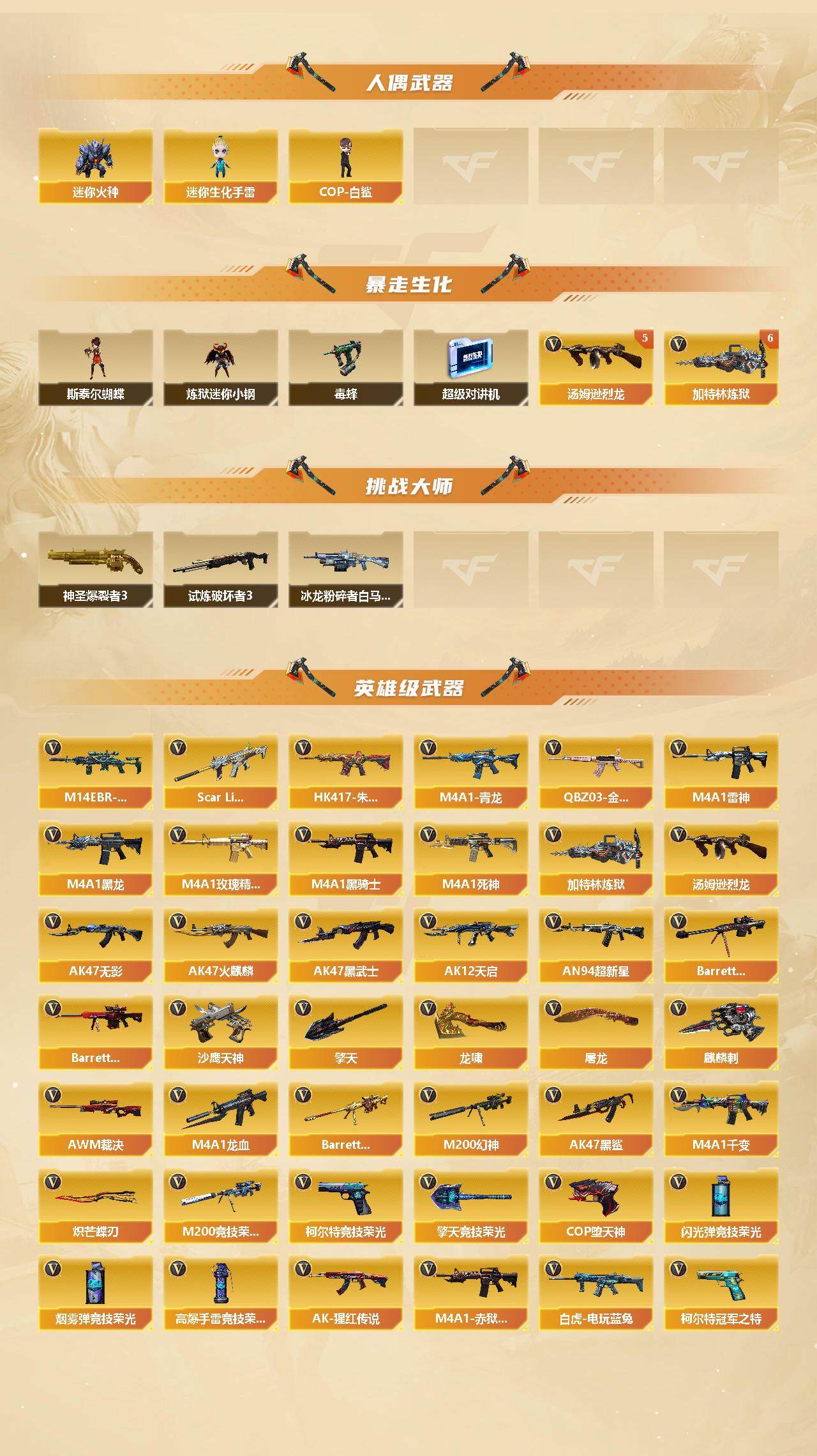 【英雄级武器】:M200-竞技荣光*2,柯尔特-竞技荣光,擎天-竞技荣光*2,高爆手雷-竞技荣光*2,烟雾弹-竞技荣光*2,闪光弹-竞技荣光*2,COP-堕天神,QBZ03-金色蔷薇,M14EBR-玄武,Scar Light-白虎*2,HK417-朱雀,M4A1-青龙,