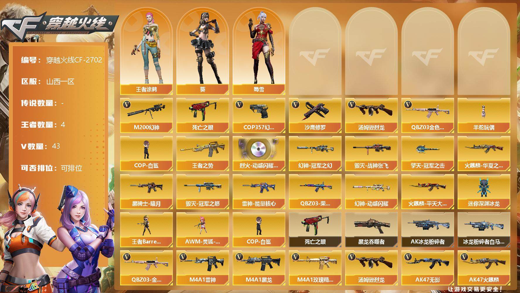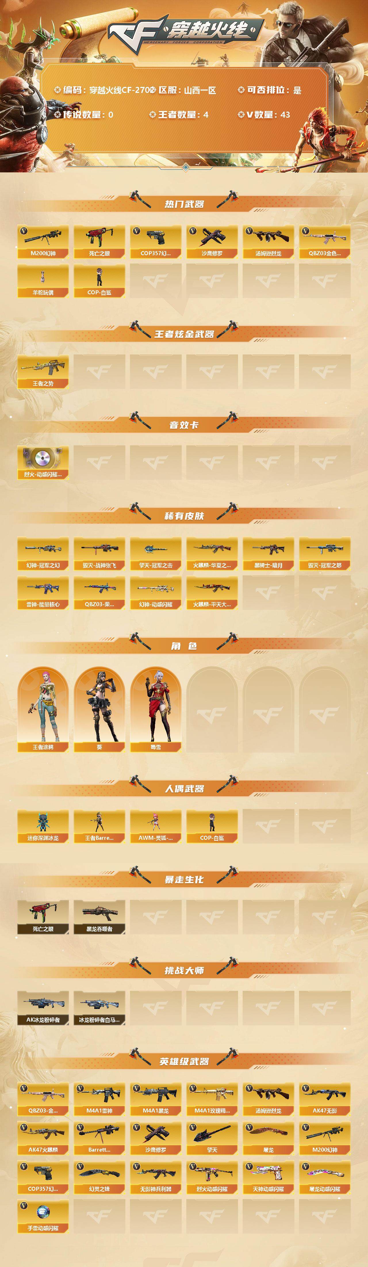 [12308707]【商品标题】:山西一区-43V-4王者-0炫金 【热门武器】:QBZ03-金色蔷薇,M200-幻神,死亡之眼,汤姆逊-烈龙*2,羊驼玩偶*2,COP-白鲨,COP 357-幻灵,沙鹰-修罗*6 【王者炫金武器】:王者之势 【音效卡】:烈火-动感闪耀 音效卡 【稀有皮肤】:幻神-冠军之幻,幻神-动感闪耀 皮肤,QBZ03-荣耀世冠白鲨,雷神-能量核心,火麒麟-华夏之心,火麒麟-平天大圣,黑骑士-暗月,毁灭-冠军之怒,毁灭-战神张飞,擎天-冠军之击 【角色】:王者涂鸦,葵,蜀雪 【人偶武器】:COP-白鲨,王者Barrett-英勇金戈,AWM-灵狐-15周年嘉年华,迷你深渊冰龙 【暴走生化】:死亡之眼,黑龙吞噬者 【挑战大师】:AK47-冰龙粉碎者,冰龙粉碎者-白马银枪 【英雄级武器】:COP 357-幻灵,幻灵之锋,烈火-动感闪耀,天神-动感闪耀,屠龙-动感闪耀,手雷-动感闪耀,QBZ03-金色蔷薇,无影-神兵利器,M4A1-雷神,M4A1-黑龙,M4A1-玫瑰精灵,汤姆逊-烈龙*2,AK47-无影,AK47-火麒麟,Barrett-毁灭,M200-幻神,沙鹰-修罗*6,擎天,屠龙*2 【特殊枪械】:2烈龙