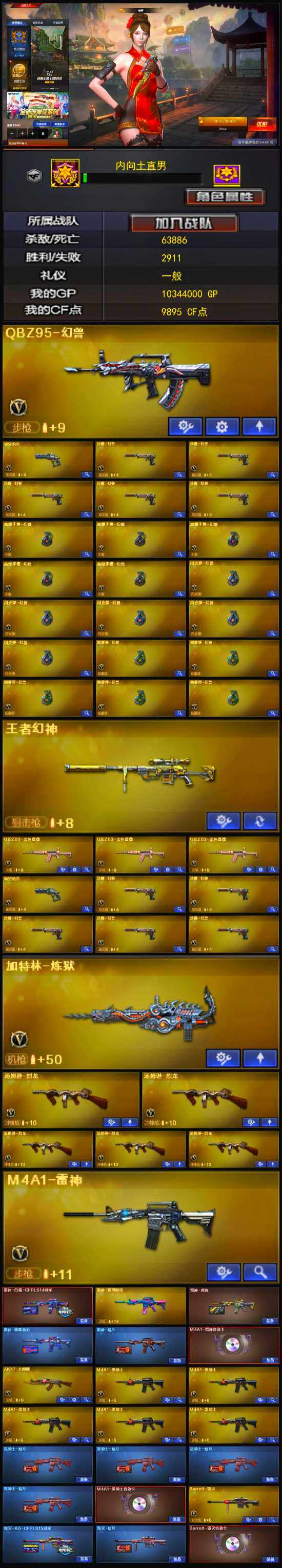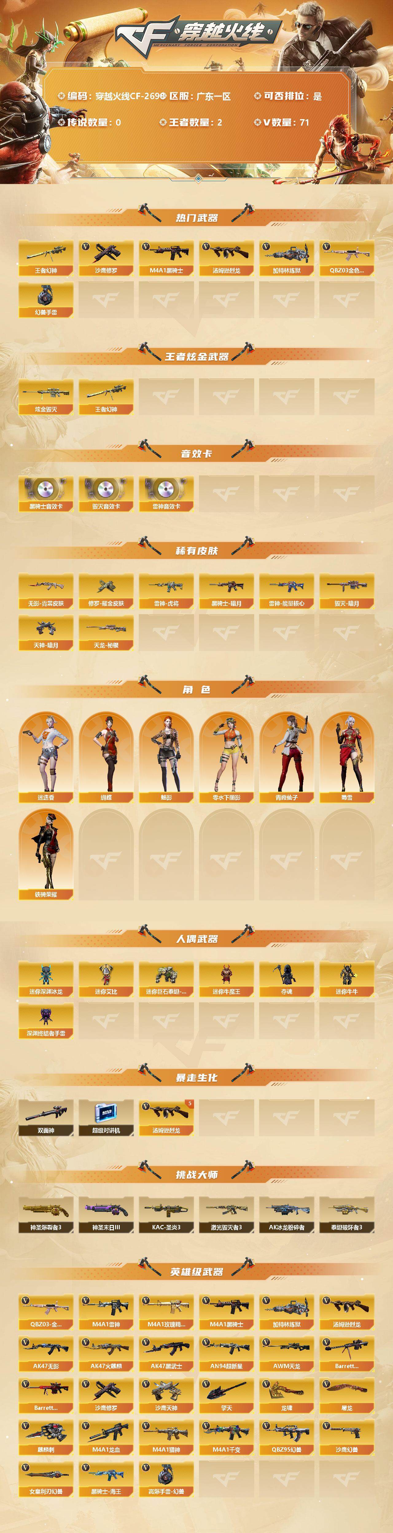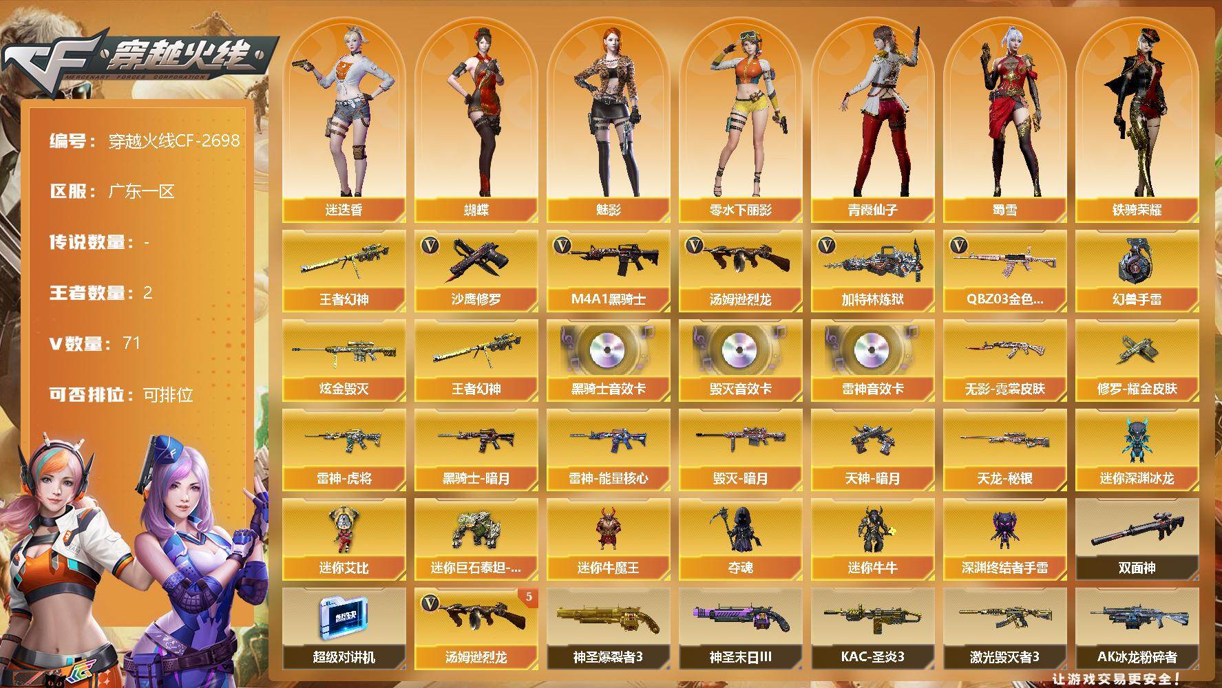 [12308685]【商品标题】:广东一区-71V-2王者-1炫金 【热门武器】:王者幻神,QBZ03-金色蔷薇*3,M4A1-黑骑士*5,汤姆逊-烈龙*5,加特林-炼狱,沙鹰-修罗*3,高爆手雷-幻兽*5 【王者炫金武器】:炫金毁灭,王者幻神 【音效卡】:M4A1-雷神音效卡,M4A1-黑骑士音效卡,Barrett-毁灭音效卡 【稀有皮肤】:雷神-能量核心,雷神-虎将,黑骑士-暗月*4,毁灭-暗月,天龙-秘银,无影-霓裳皮肤,修罗耀金皮肤,天神-暗月*2 【角色】:零-水下丽影,蝴蝶,魅影,迷迭香,蜀雪,铁骑荣耀,青霞仙子 【人偶武器】:迷你深渊冰龙,迷你艾比,迷你巨石泰坦-魔花研究所,迷你牛魔王,夺魂*2,迷你牛牛,深渊终结者手雷 【暴走生化】:双面神,超级对讲机 【挑战大师】:神圣爆裂者III,神圣爆裂者-末日III,KAC-圣炎切割者III,激光毁灭者III,AK47-泰坦破坏者III,AK47-冰龙粉碎者 【英雄级武器】:QBZ95-幻兽,沙鹰-幻兽*5,女皇利刃-幻兽,QBZ03-金色蔷薇*3,M4A1-雷神,M4A1-玫瑰精灵,M4A1-黑骑士*5,加特林-炼狱,汤姆逊-烈龙*5,AK47-无影,AK47-火麒麟,AK47-黑武士,AN94-超新星,AWM-天龙*2,Barrett-毁灭,Barrett-极光,M4A1-龙血*2,M4A1-猎神,M4A1-千变,黑骑士-海王,沙鹰-天神*2,沙鹰-修罗*3,麒麟刺*3,擎天,龙啸,屠龙*4,高爆手雷-幻兽*5 【特殊枪械】:5黑骑士,5烈龙,1炼狱