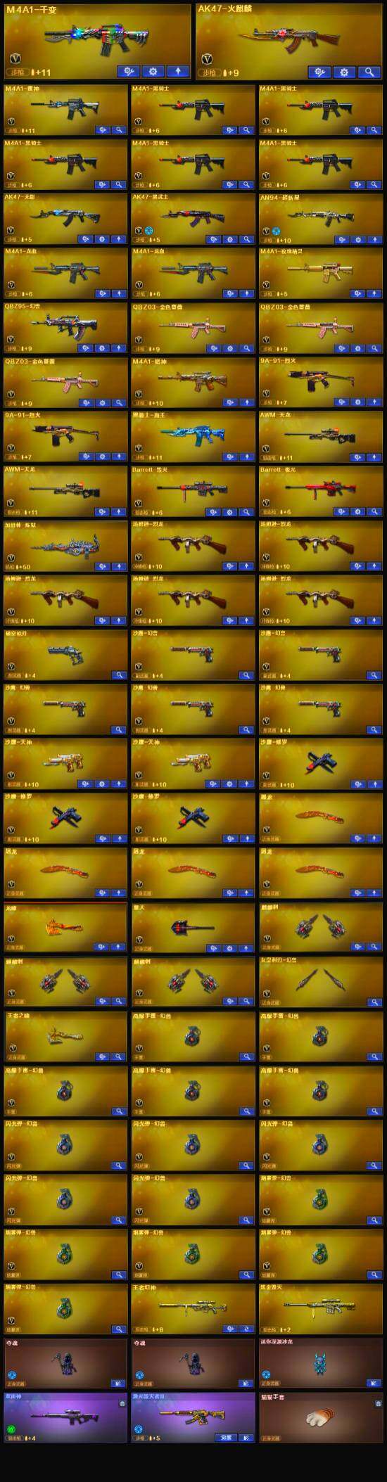 【英雄级武器】:QBZ95-幻兽,沙鹰-幻兽*5,女皇利刃-幻兽,QBZ03-金色蔷薇*3,M4A1-雷神,M4A1-玫瑰精灵,M4A1-黑骑士*5,加特林-炼狱,汤姆逊-烈龙*5,AK47-无影,AK47-火麒麟,AK47-黑武士,AN94-超新星,AWM-天龙*2,Barrett-毁灭,Barrett-极光,M4A1-龙血*2,M4A1-猎神,M4A1-千变,黑骑士-海王,沙鹰-天神*2,沙鹰-修罗*3,麒麟刺*3,擎天,龙啸,屠龙*4,高爆手雷-幻兽*5