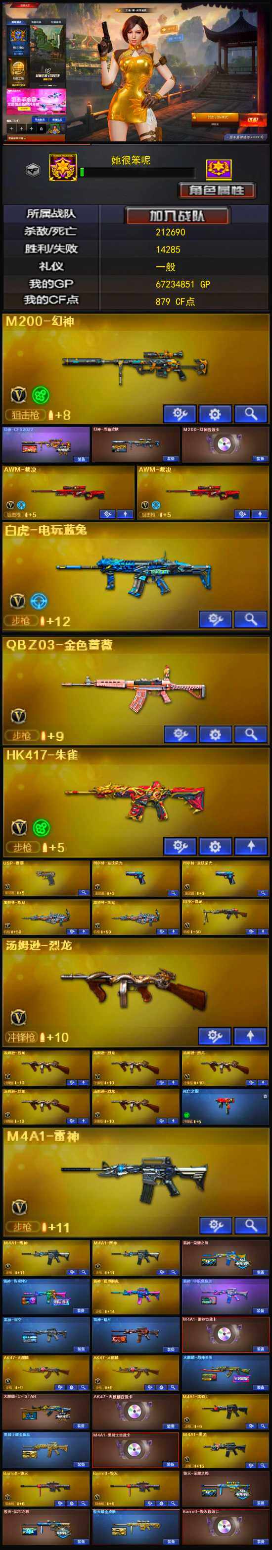 【热门武器】:QBZ03-金色蔷薇,HK417-朱雀,M200-幻神,死亡之眼,白虎-电玩蓝兔,M4A1-黑骑士,汤姆逊-烈龙*6,RPK-盘龙,加特林-炼狱*2,USP-雷暴,沙鹰-修罗*3
