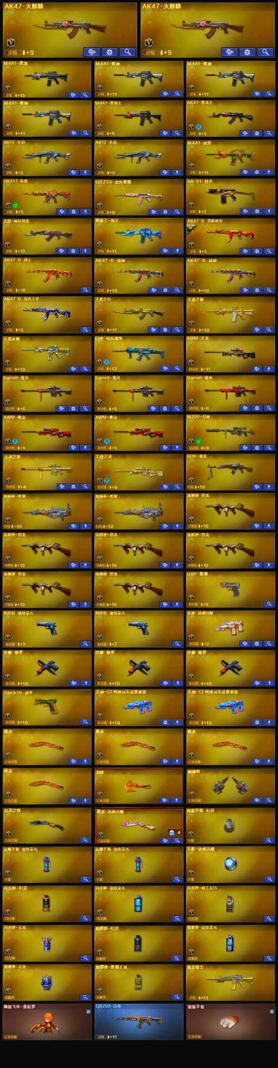【英雄级武器】:柯尔特-竞技荣光*2,高爆手雷-竞技荣光*2,烟雾弹-竞技荣光,闪光弹-竞技荣光,幻灵之锋,USP-雷暴,M4A1-武圣,Glock18-武圣,天神-动感闪耀,屠龙-动感闪耀,手雷-动感闪耀,QBZ03-金色蔷薇,HK417-朱雀,白虎-电玩蓝兔,无影-神兵利器,M4A1-雷神*3,M4A1-黑龙,M4A1-黑骑士,RPK-盘龙,加特林-炼狱*2,汤姆逊-烈龙*6,AK47-火麒麟*2,AK47-黑武士,AK12-天启*2,AWM-天龙,Barrett-毁灭*2,Barrett-极光,AWM-裁决*2,M200-幻神,黑骑士-海王,AK-47-猩红传说*2,AK47-B-战神*2,AK47-B-常胜将军,沙鹰-修罗*3,麒麟刺,龙啸,屠龙*4