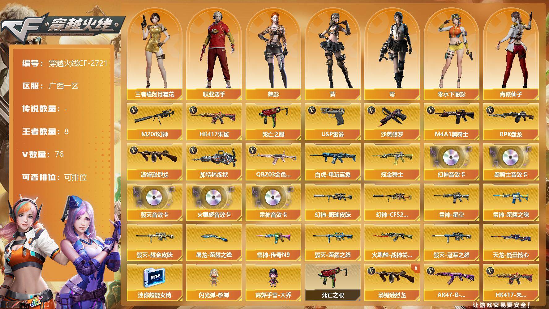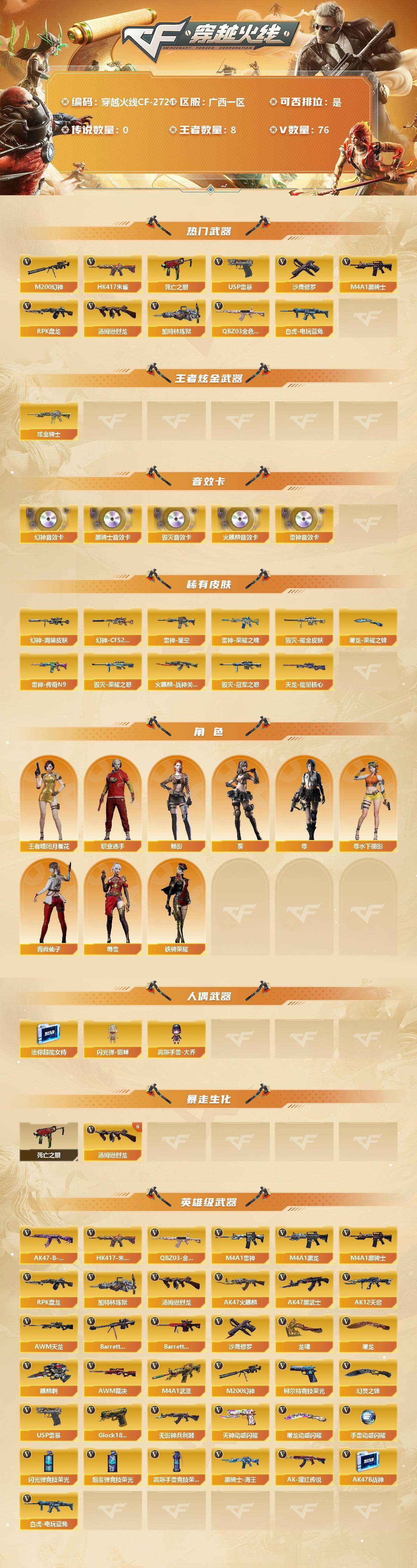 [12308770]【商品标题】:广西一区-76V-8王者-1炫金 【热门武器】:QBZ03-金色蔷薇,HK417-朱雀,M200-幻神,死亡之眼,白虎-电玩蓝兔,M4A1-黑骑士,汤姆逊-烈龙*6,RPK-盘龙,加特林-炼狱*2,USP-雷暴,沙鹰-修罗*3 【王者炫金武器】:炫金骑士 【音效卡】:M200-幻神音效卡,AK47-火麒麟音效卡,M4A1-雷神音效卡,M4A1-黑骑士音效卡,Barrett-毁灭音效卡 【稀有皮肤】:幻神-周瑜皮肤,幻神-CFS2022,雷神-荣耀之魄,雷神-星空,雷神-传奇N9,火麒麟-战神关羽,毁灭-荣耀之怒,毁灭耀金皮肤,毁灭-冠军之怒,天龙-能量核心,屠龙-荣耀之锋 【角色】:王者-瞳-闭月羞花,零-水下丽影,零,葵,魅影,蜀雪,铁骑荣耀,职业选手,青霞仙子 【人偶武器】:迷你超能女侍,闪光弹-貂蝉,高爆手雷-大乔 【暴走生化】:死亡之眼 【英雄级武器】:柯尔特-竞技荣光*2,高爆手雷-竞技荣光*2,烟雾弹-竞技荣光,闪光弹-竞技荣光,幻灵之锋,USP-雷暴,M4A1-武圣,Glock18-武圣,天神-动感闪耀,屠龙-动感闪耀,手雷-动感闪耀,QBZ03-金色蔷薇,HK417-朱雀,白虎-电玩蓝兔,无影-神兵利器,M4A1-雷神*3,M4A1-黑龙,M4A1-黑骑士,RPK-盘龙,加特林-炼狱*2,汤姆逊-烈龙*6,AK47-火麒麟*2,AK47-黑武士,AK12-天启*2,AWM-天龙,Barrett-毁灭*2,Barrett-极光,AWM-裁决*2,M200-幻神,黑骑士-海王,AK-47-猩红传说*2,AK47-B-战神*2,AK47-B-常胜将军,沙鹰-修罗*3,麒麟刺,龙啸,屠龙*4 【特殊枪械】:1黑骑士,6烈龙,1盘龙,2炼狱