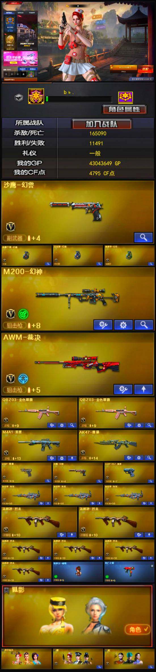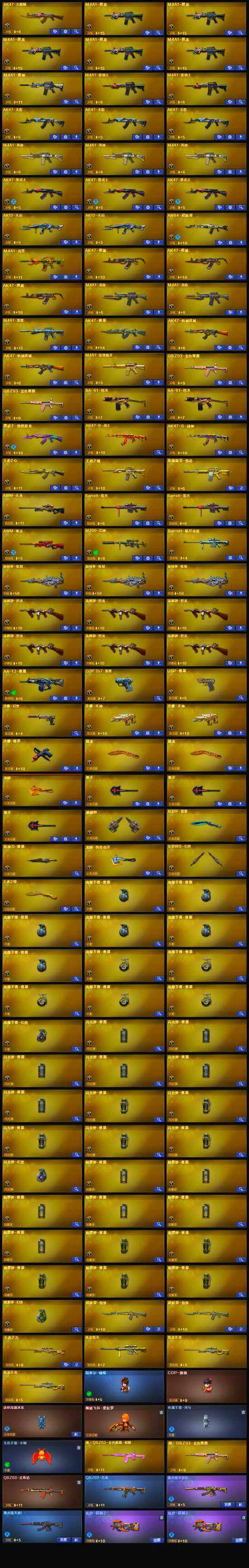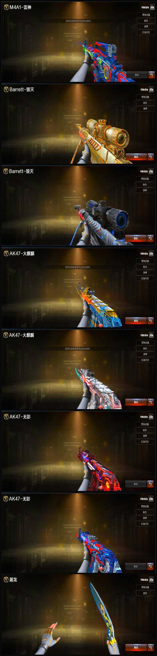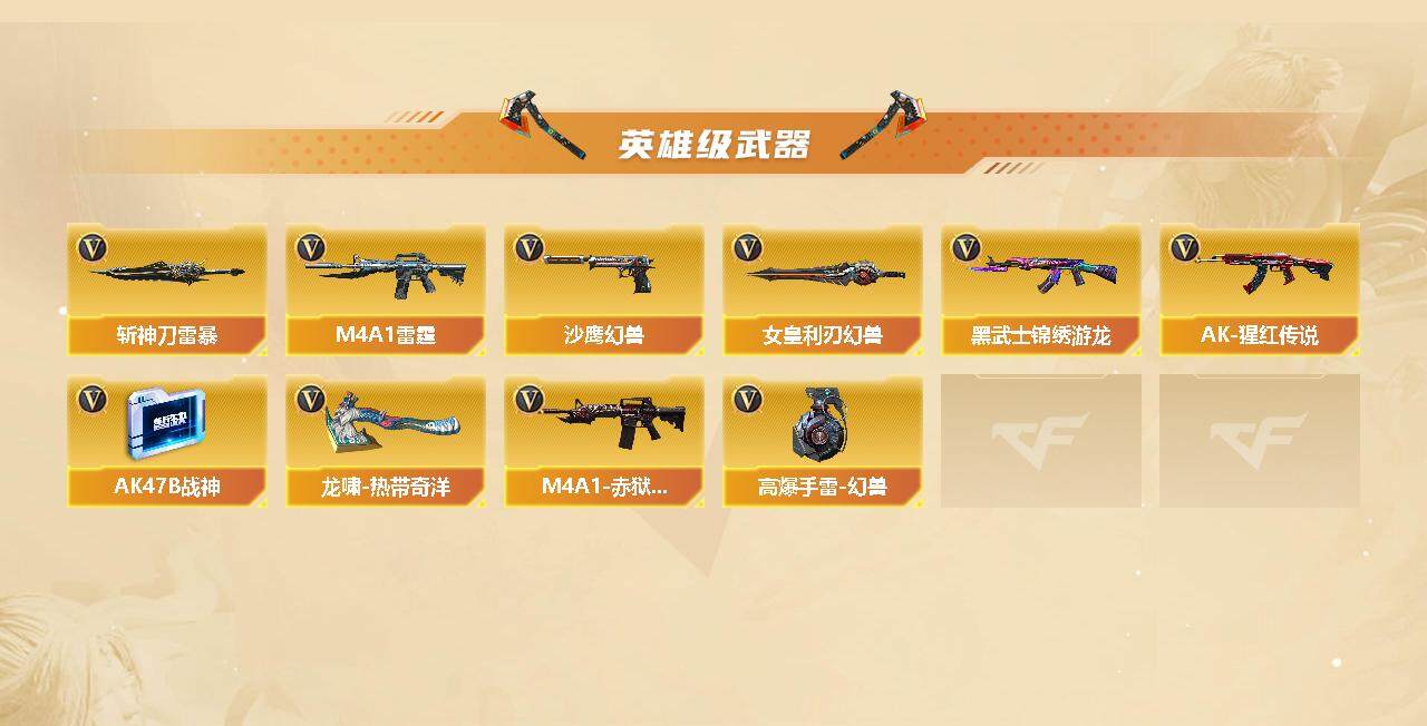 【英雄级武器】:AK47-雷暴,USP-雷暴,斩神刀-雷暴,M4A1-雷霆,沙鹰-幻兽,女皇利刃-幻兽,M4A1-武圣,QBZ03-金色蔷薇*2,M4A1-雷神,M4A1-黑龙*5,M4A1-玫瑰精灵,M4A1-黑骑士*2,M4A1-死神*3,加特林-炼狱*3,汤姆逊-烈龙*6,AK47-无影*3,AK47-火麒麟,AK47-黑武士*3,AK12-天启*2,AN94-超新星,AWM-天龙,Barrett-毁灭*2,AWM-裁决,M4A1-龙血*2,AK47-机械迷城*2,AA-12-雷霆,M200-幻神,AK47-黑鲨*3,黑武士-锦绣游龙,AK-47-猩红传说*7,AK47-B-战神,M4A1-赤狱骑士,沙鹰-天神*2,沙鹰-修罗,麒麟刺,擎天*3,龙啸,屠龙*2,龙啸-热带奇洋,高爆手雷-幻兽