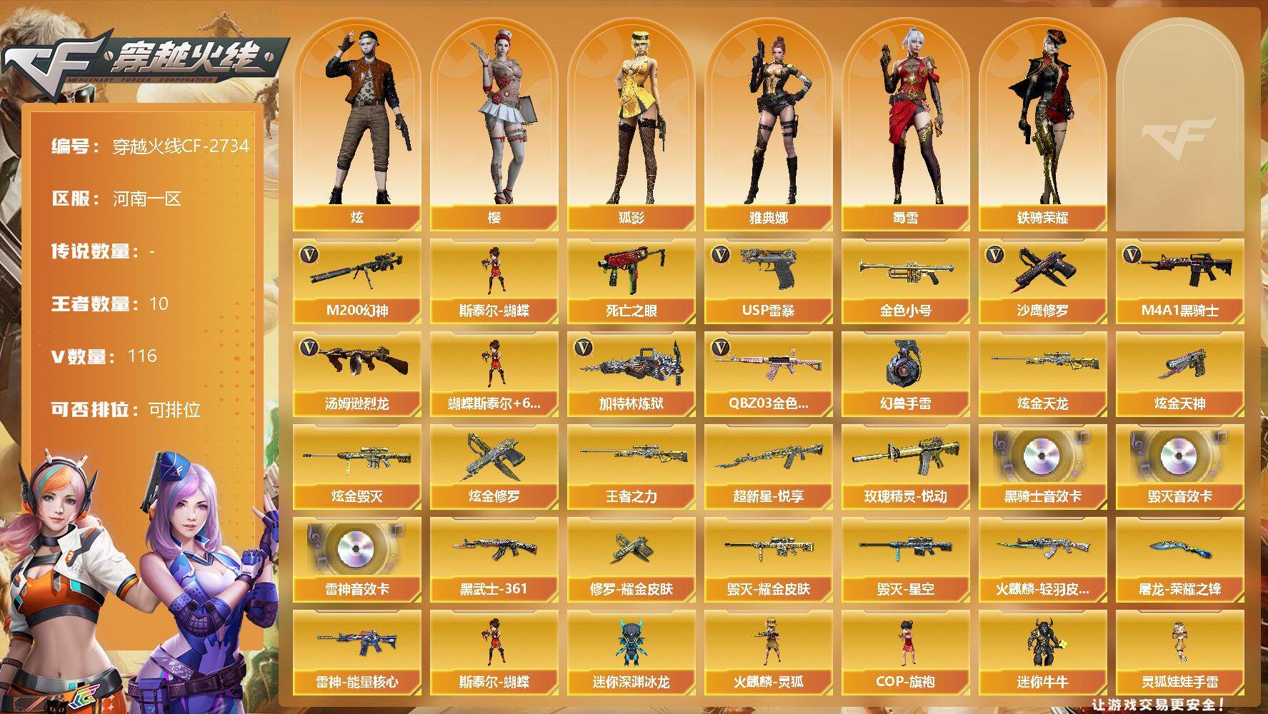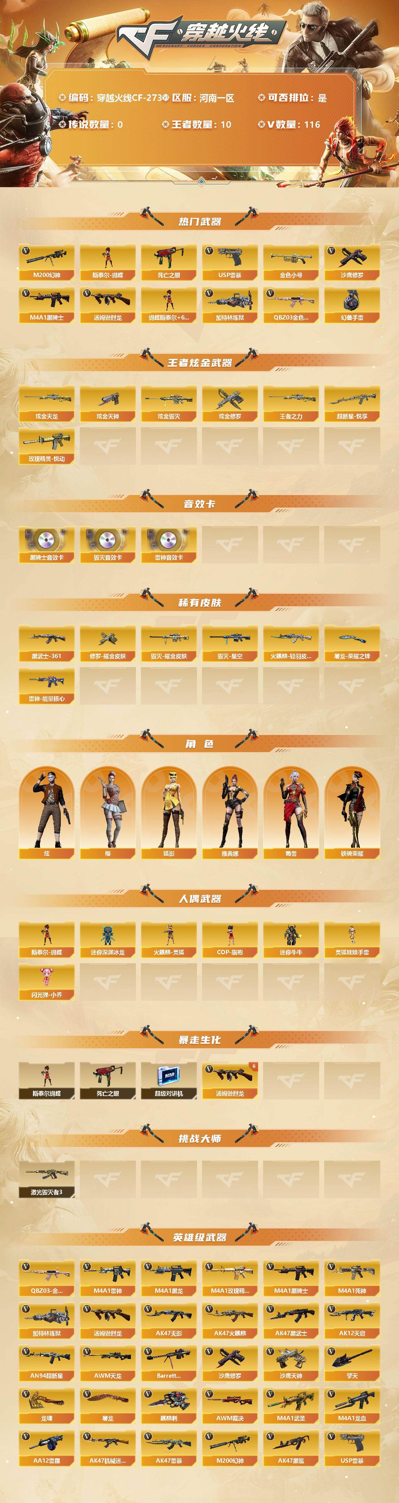 [12308852]【商品标题】:河南一区-116V-10王者-6炫金 【热门武器】:QBZ03-金色蔷薇*2,M200-幻神,死亡之眼,金色小号,M4A1-黑骑士*2,汤姆逊-烈龙*6,加特林-炼狱*3,斯泰尔-蝴蝶,USP-雷暴,沙鹰-修罗,高爆手雷-幻兽 【王者炫金武器】:炫金天龙*2,炫金天神,炫金毁灭,炫金修罗*2,超新星-悦享*2,玫瑰精灵-悦动,王者之力 【音效卡】:M4A1-雷神音效卡,M4A1-黑骑士音效卡,Barrett-毁灭音效卡 【稀有皮肤】:雷神-能量核心,火麒麟-轻羽皮肤,毁灭耀金皮肤*2,毁灭-星空,AK47-黑武士-361,修罗耀金皮肤,屠龙-荣耀之锋 【角色】:雅典娜,狐影,樱,炫,蜀雪,铁骑荣耀 【人偶武器】:斯泰尔-蝴蝶,火麒麟-灵狐,COP-旗袍,迷你深渊冰龙,迷你牛牛,灵狐娃娃手雷,闪光弹-小乔 【暴走生化】:斯泰尔-蝴蝶,死亡之眼,超级对讲机 【挑战大师】:激光毁灭者III 【英雄级武器】:AK47-雷暴,USP-雷暴,斩神刀-雷暴,M4A1-雷霆,沙鹰-幻兽,女皇利刃-幻兽,M4A1-武圣,QBZ03-金色蔷薇*2,M4A1-雷神,M4A1-黑龙*5,M4A1-玫瑰精灵,M4A1-黑骑士*2,M4A1-死神*3,加特林-炼狱*3,汤姆逊-烈龙*6,AK47-无影*3,AK47-火麒麟,AK47-黑武士*3,AK12-天启*2,AN94-超新星,AWM-天龙,Barrett-毁灭*2,AWM-裁决,M4A1-龙血*2,AK47-机械迷城*2,AA-12-雷霆,M200-幻神,AK47-黑鲨*3,黑武士-锦绣游龙,AK-47-猩红传说*7,AK47-B-战神,M4A1-赤狱骑士,沙鹰-天神*2,沙鹰-修罗,麒麟刺,擎天*3,龙啸,屠龙*2,龙啸-热带奇洋,高爆手雷-幻兽 【特殊枪械】:蝴蝶斯泰尔+6烈龙,2黑骑士,6烈龙,3炼狱,1蝴蝶斯泰尔