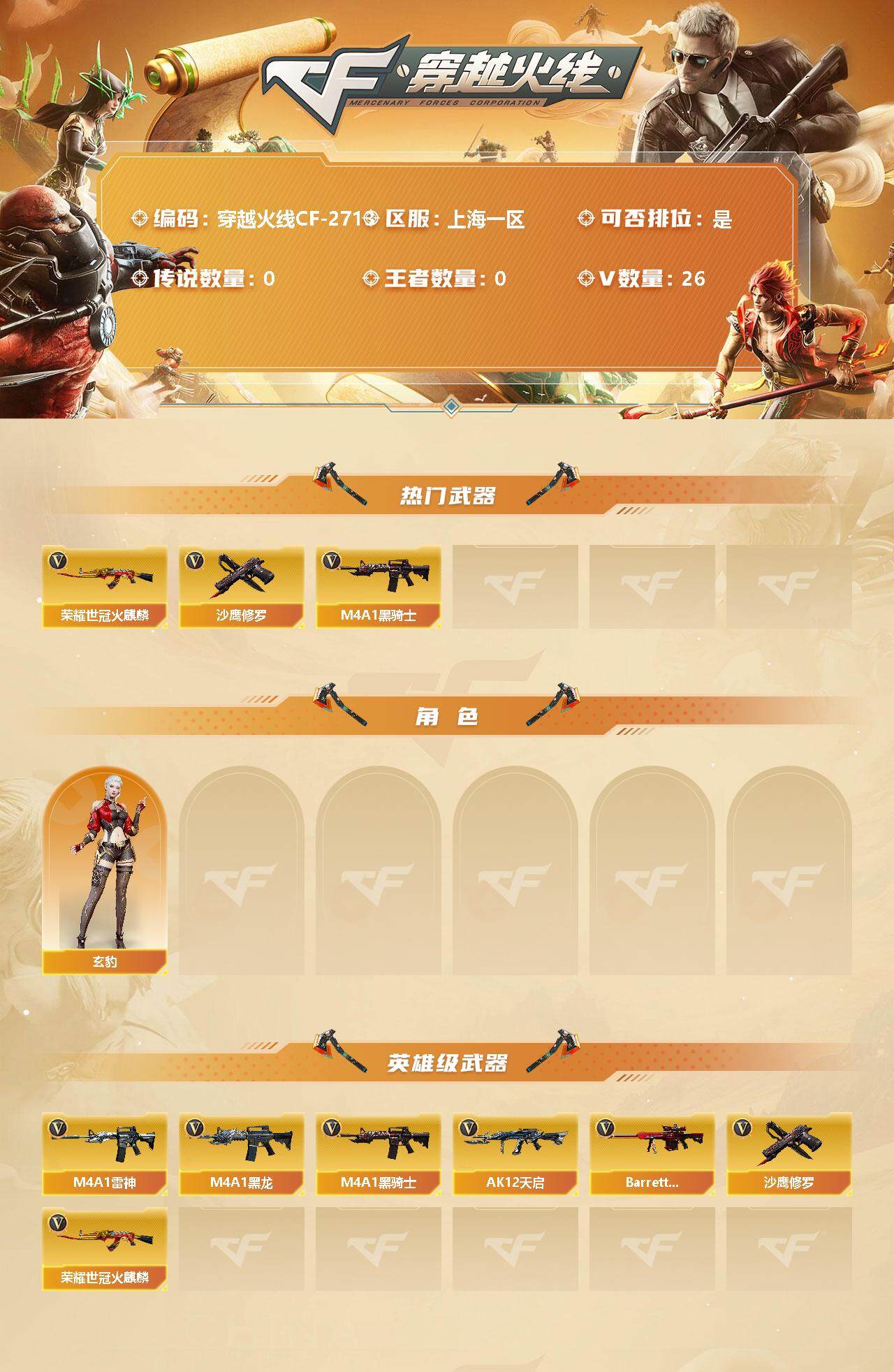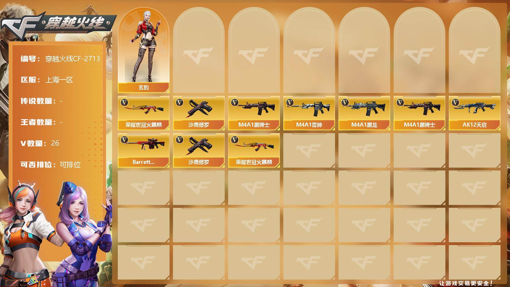 [12308737]【商品标题】:上海一区-26V-0王者-0炫金 【热门武器】:荣耀世冠-火麒麟,M4A1-黑骑士,沙鹰-修罗*2 【角色】:玄豹 【英雄级武器】:荣耀世冠-火麒麟,M4A1-雷神,M4A1-黑龙,M4A1-黑骑士,AK12-天启,Barrett-极光,沙鹰-修罗*2 【特殊枪械】:1黑骑士