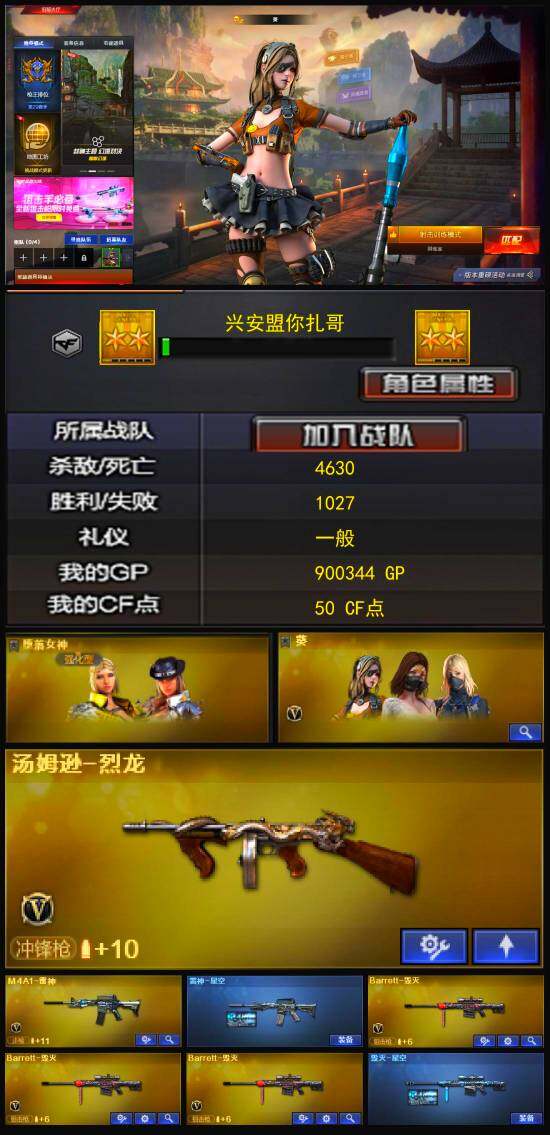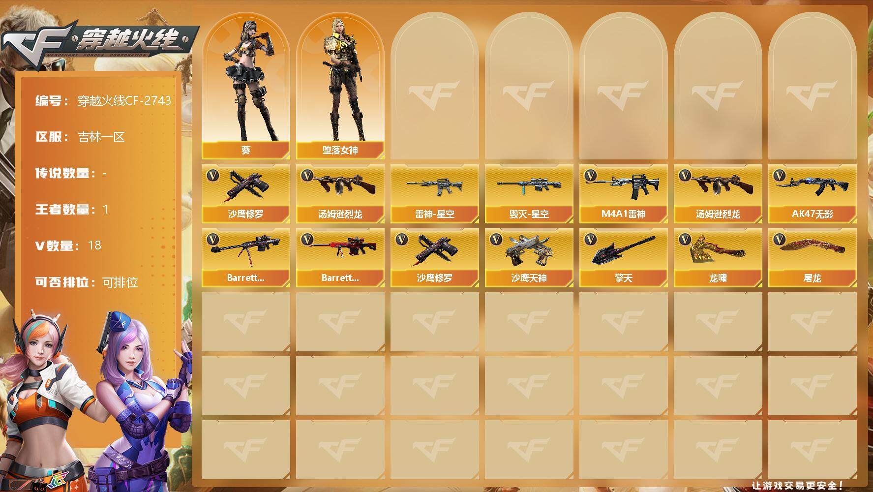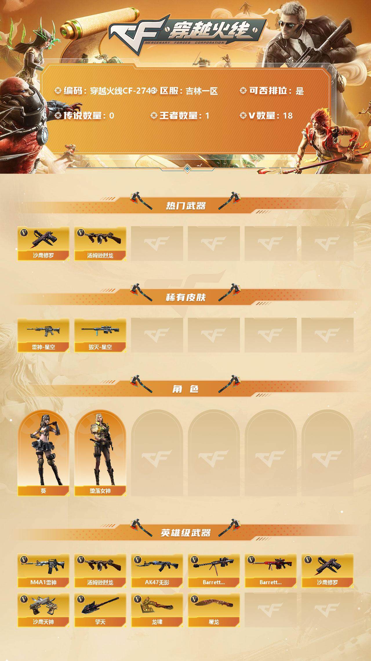 [12308922]【商品标题】:吉林一区-18V-1王者-0炫金 【热门武器】:汤姆逊-烈龙,沙鹰-修罗 【稀有皮肤】:雷神-星空,毁灭-星空 【角色】:堕落女神,葵 【英雄级武器】:M4A1-雷神,汤姆逊-烈龙,AK47-无影*4,Barrett-毁灭*3,Barrett-极光,沙鹰-天神*3,沙鹰-修罗,擎天,龙啸,屠龙 【特殊枪械】:1烈龙