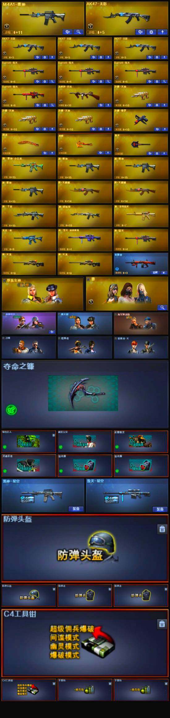 【英雄级武器】:M4A1-雷神,汤姆逊-烈龙,AK47-无影*4,Barrett-毁灭*3,Barrett-极光,沙鹰-天神*3,沙鹰-修罗,擎天,龙啸,屠龙