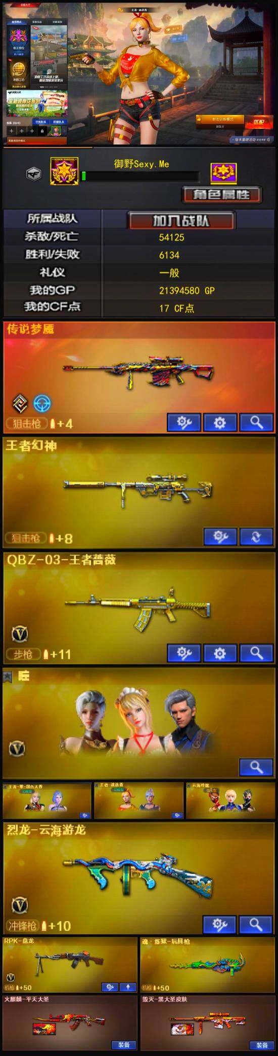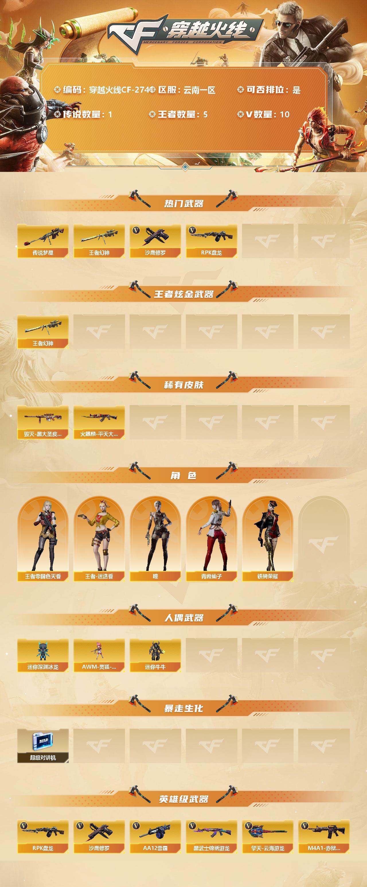 [12308898]【商品标题】:云南一区-10V-5王者-0炫金 【传说武器】:传说梦魇 【热门武器】:传说梦魇,王者幻神,RPK-盘龙,沙鹰-修罗 【王者炫金武器】:王者幻神 【稀有皮肤】:火麒麟-平天大圣,毁灭-黑大圣皮肤 【角色】:王者-零-国色天香,王者-迷迭香,瞳,铁骑荣耀,青霞仙子 【人偶武器】:AWM-灵狐-15周年嘉年华,迷你深渊冰龙,迷你牛牛 【暴走生化】:超级对讲机 【英雄级武器】:RPK-盘龙,AA-12-雷霆,黑武士-锦绣游龙,M4A1-赤狱骑士,沙鹰-修罗,擎天-云海游龙 【特殊枪械】:1盘龙