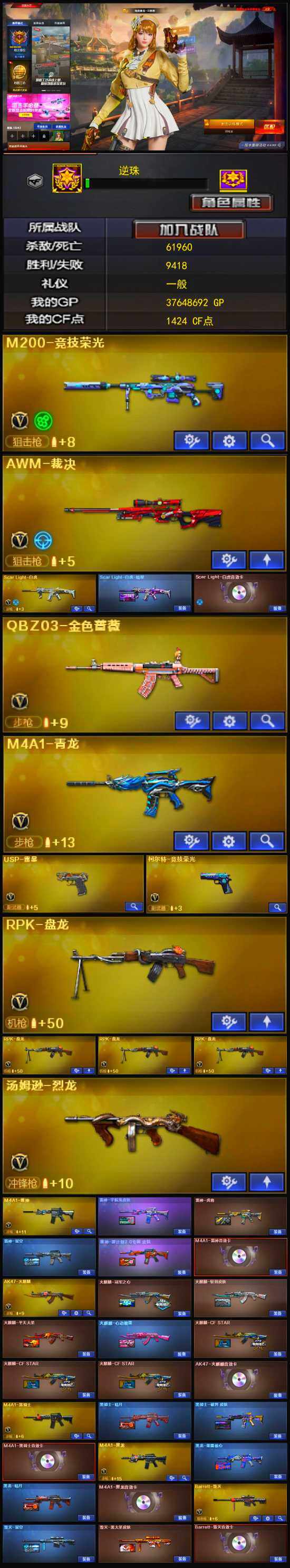 【热门武器】:QBZ03-金色蔷薇,Scar Light-白虎,M4A1-青龙,M200-竞技荣光,M4A1-黑骑士,汤姆逊-烈龙,RPK-盘龙*4,裁决-雪莉杨,USP-雷暴,沙鹰-修罗*2
