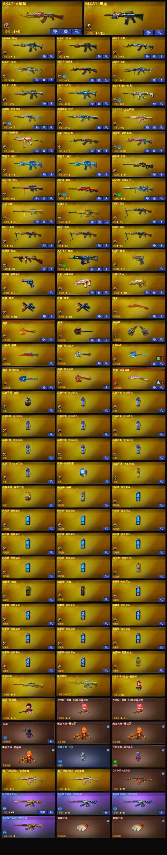 【英雄级武器】:M200-竞技荣光,柯尔特-竞技荣光,擎天-竞技荣光,高爆手雷-竞技荣光*9,烟雾弹-竞技荣光*9,闪光弹-竞技荣光*9,马来剑-夜魔,USP-雷暴,烈火-动感闪耀,天神-动感闪耀,屠龙-动感闪耀,手雷-动感闪耀,QBZ03-金色蔷薇,Scar Light-白虎,M4A1-青龙,无影-神兵利器,M4A1-雷神,M4A1-黑龙,M4A1-黑骑士,M4A1-死神,RPK-盘龙*4,汤姆逊-烈龙,AK47-无影,AK47-火麒麟,AK47-黑武士,AK12-天启,AWM-天龙,Barrett-毁灭,AWM-裁决,M4A1-龙血,AA-12-雷霆,黑武士-锦绣游龙,黑骑士-海王*2,超新星-热带奇洋,M4A1-赤狱骑士,沙鹰-天神,沙鹰-修罗*2,麒麟刺,擎天,龙啸,屠龙,龙啸-热带奇洋