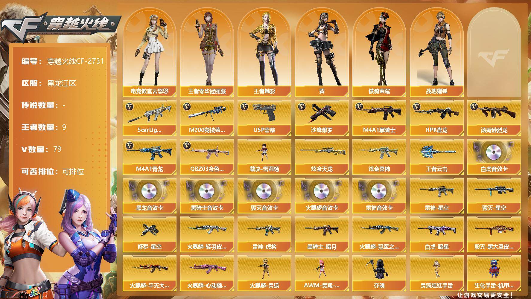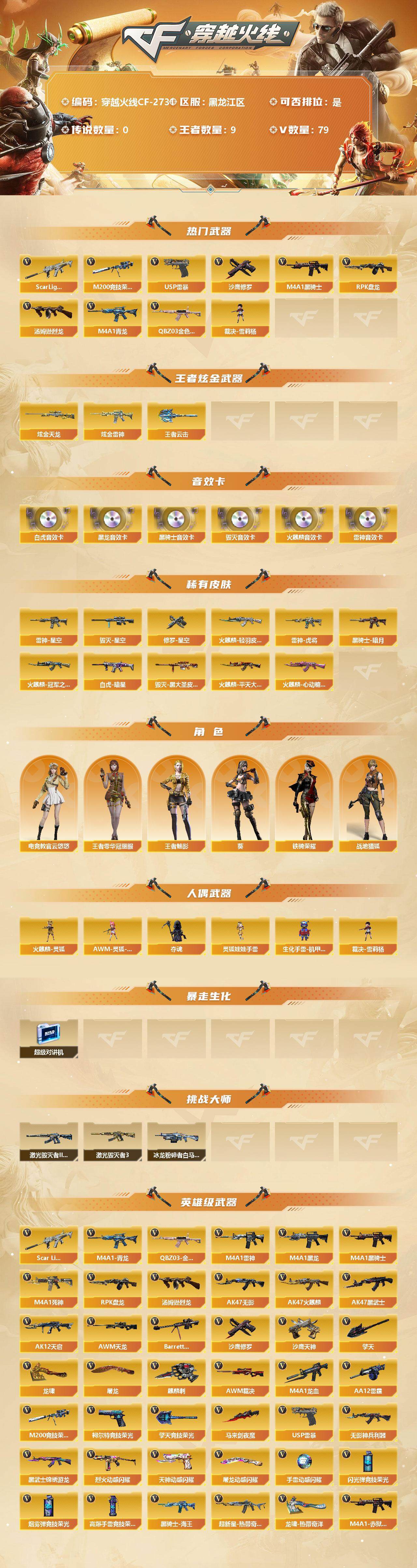 [12308820]【商品标题】:黑龙江区-79V-9王者-2炫金 【热门武器】:QBZ03-金色蔷薇,Scar Light-白虎,M4A1-青龙,M200-竞技荣光,M4A1-黑骑士,汤姆逊-烈龙,RPK-盘龙*4,裁决-雪莉杨,USP-雷暴,沙鹰-修罗*2 【王者炫金武器】:炫金天龙,炫金雷神,王者云击 【音效卡】:AK47-火麒麟音效卡,M4A1-雷神音效卡,M4A1-黑龙音效卡,M4A1-黑骑士音效卡,Barrett-毁灭音效卡,Scar Light-白虎音效卡 【稀有皮肤】:Scar Light-白虎-暗星,雷神-星空,雷神-虎将,火麒麟-冠军之心,火麒麟-轻羽皮肤,火麒麟-平天大圣,火麒麟-心动糖果,黑骑士-暗月,毁灭-星空,毁灭-黑大圣皮肤,修罗-星空 【角色】:王者零-华冠丽服,王者-魅影,葵,电竞教官-云悠悠,战地猎狐,铁骑荣耀 【人偶武器】:裁决-雪莉杨,火麒麟-灵狐,AWM-灵狐-15周年嘉年华*2,夺魂,灵狐娃娃手雷,生化手雷-机甲核心 【暴走生化】:超级对讲机 【挑战大师】:激光毁灭者III,激光毁灭者III-白马银枪*2,冰龙粉碎者-白马银枪 【英雄级武器】:M200-竞技荣光,柯尔特-竞技荣光,擎天-竞技荣光,高爆手雷-竞技荣光*9,烟雾弹-竞技荣光*9,闪光弹-竞技荣光*9,马来剑-夜魔,USP-雷暴,烈火-动感闪耀,天神-动感闪耀,屠龙-动感闪耀,手雷-动感闪耀,QBZ03-金色蔷薇,Scar Light-白虎,M4A1-青龙,无影-神兵利器,M4A1-雷神,M4A1-黑龙,M4A1-黑骑士,M4A1-死神,RPK-盘龙*4,汤姆逊-烈龙,AK47-无影,AK47-火麒麟,AK47-黑武士,AK12-天启,AWM-天龙,Barrett-毁灭,AWM-裁决,M4A1-龙血,AA-12-雷霆,黑武士-锦绣游龙,黑骑士-海王*2,超新星-热带奇洋,M4A1-赤狱骑士,沙鹰-天神,沙鹰-修罗*2,麒麟刺,擎天,龙啸,屠龙,龙啸-热带奇洋 【特殊枪械】:1白虎,1黑骑士,1烈龙,4盘龙