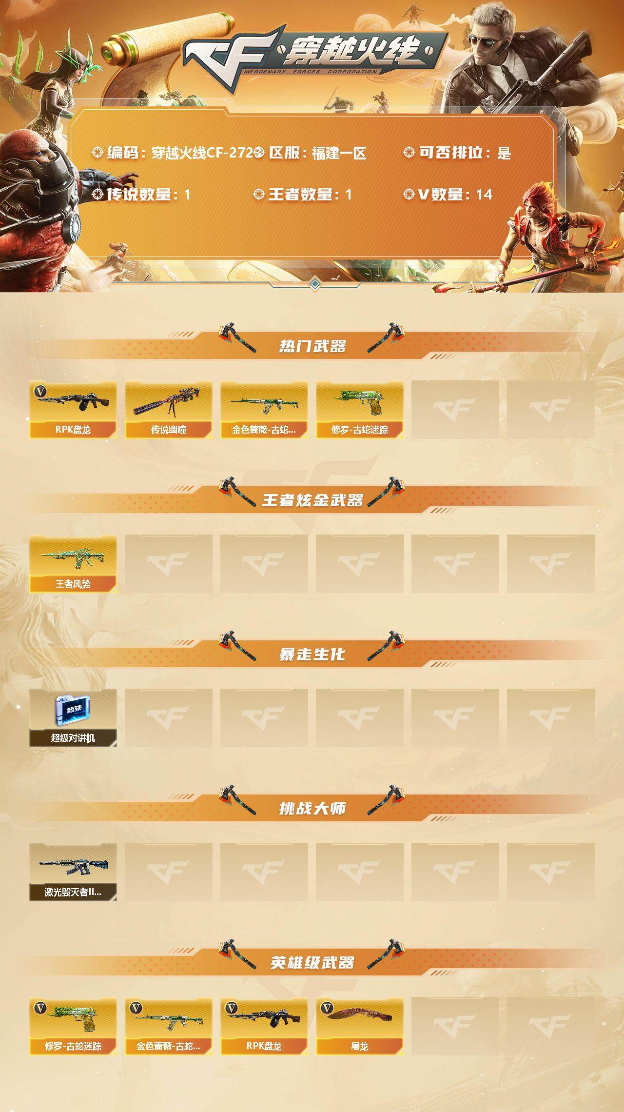 [12308783]【商品标题】:福建一区-14V-1王者-0炫金 【传说武器】:传说幽瞳 【热门武器】:传说幽瞳,金色蔷薇-古蛇迷踪,修罗-古蛇迷踪,RPK-盘龙 【王者炫金武器】:王者风势 【暴走生化】:超级对讲机 【挑战大师】:激光毁灭者III-白马银枪 【英雄级武器】:金色蔷薇-古蛇迷踪,RPK-盘龙,修罗-古蛇迷踪,屠龙 【特殊枪械】:1盘龙