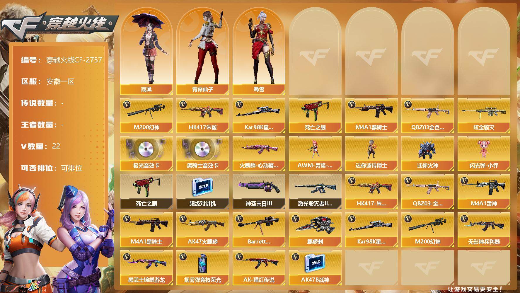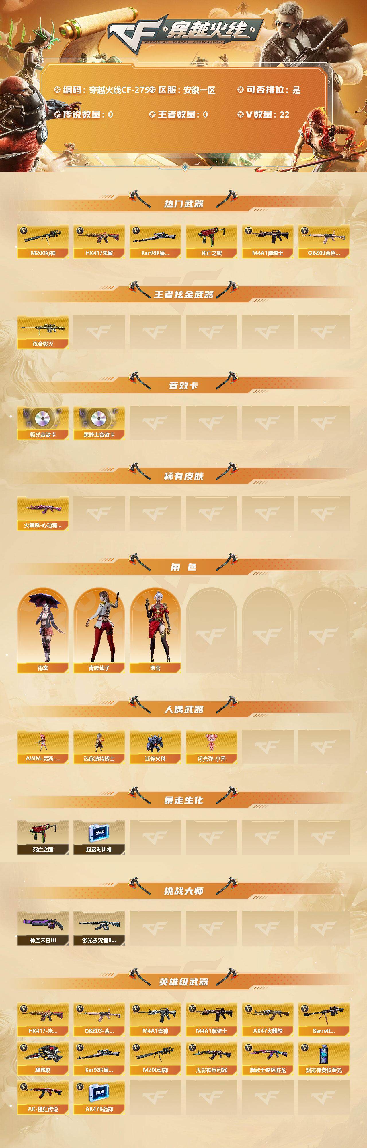 [12308972]【商品标题】:安徽一区-22V-0王者-1炫金 【热门武器】:QBZ03-金色蔷薇,HK417-朱雀,M200-幻神,死亡之眼,Kar98K-星神,M4A1-黑骑士 【王者炫金武器】:炫金毁灭 【音效卡】:M4A1-黑骑士音效卡,Barrett-极光音效卡 【稀有皮肤】:火麒麟-心动糖果 【角色】:雨棠,蜀雪,青霞仙子 【人偶武器】:AWM-灵狐-15周年嘉年华,迷你波特博士*2,迷你火种,闪光弹-小乔 【暴走生化】:死亡之眼,超级对讲机 【挑战大师】:神圣爆裂者-末日III,激光毁灭者III-白马银枪 【英雄级武器】:烟雾弹-竞技荣光,QBZ03-金色蔷薇,HK417-朱雀,无影-神兵利器,M4A1-雷神,M4A1-黑骑士,AK47-火麒麟,Barrett-毁灭,Kar98K-星神,M200-幻神,黑武士-锦绣游龙,AK-47-猩红传说,AK47-B-战神,麒麟刺 【特殊枪械】:1黑骑士