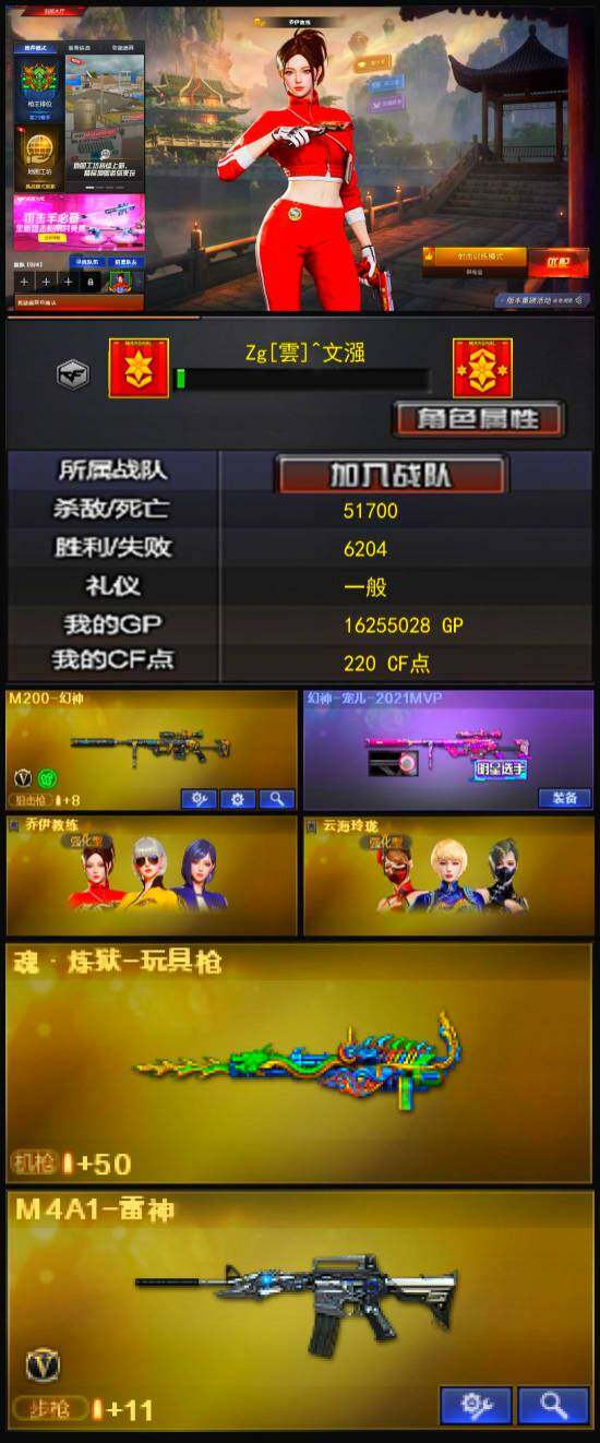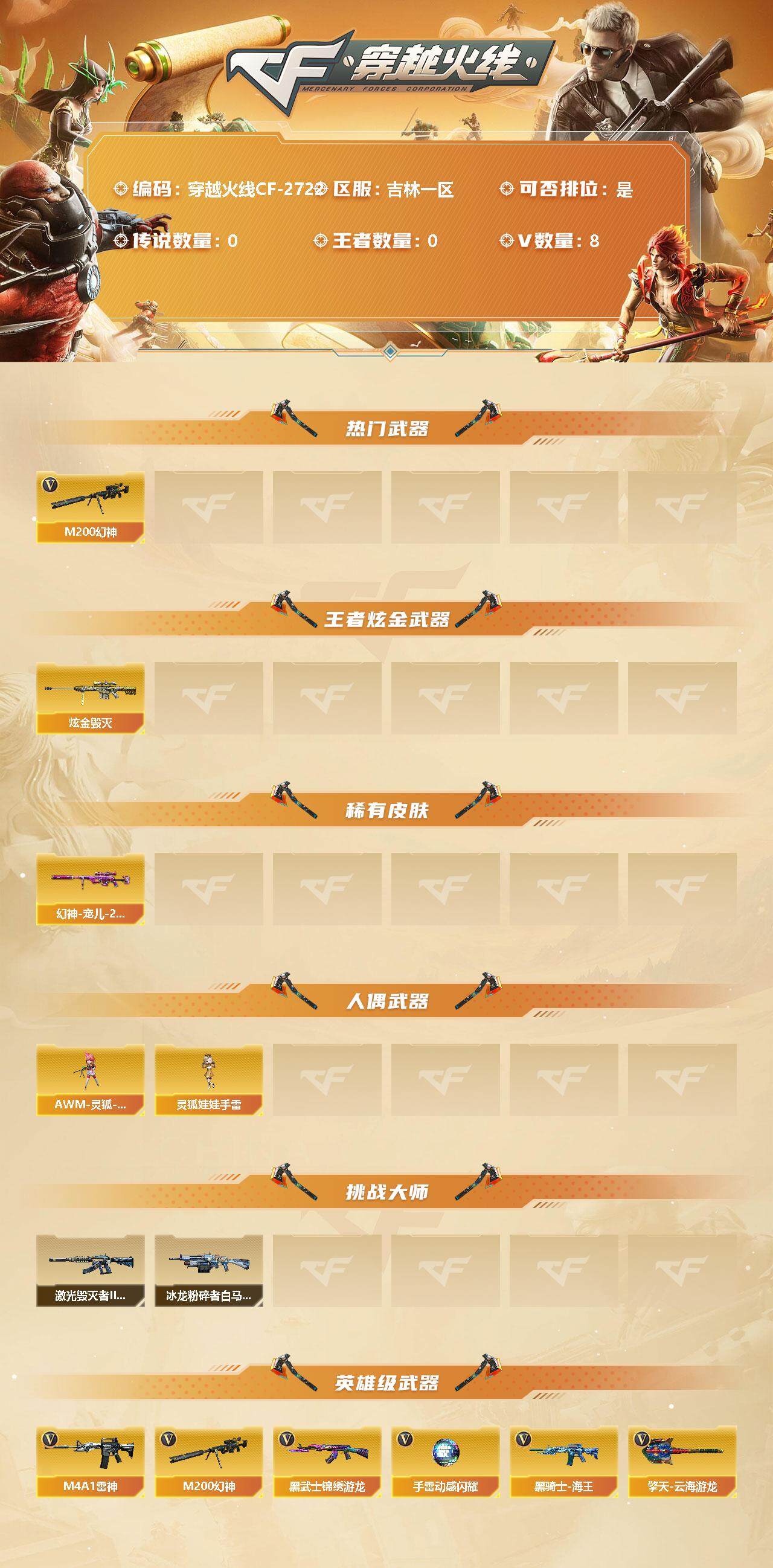 [12308774]【商品标题】:吉林一区-8V-0王者-1炫金 【热门武器】:M200-幻神 【王者炫金武器】:炫金毁灭 【稀有皮肤】:幻神-宠儿-2021MVP 【人偶武器】:AWM-灵狐-15周年嘉年华,灵狐娃娃手雷 【挑战大师】:激光毁灭者III-白马银枪,冰龙粉碎者-白马银枪 【英雄级武器】:手雷-动感闪耀,M4A1-雷神,M200-幻神,黑武士-锦绣游龙,黑骑士-海王,擎天-云海游龙 【特殊枪械】: