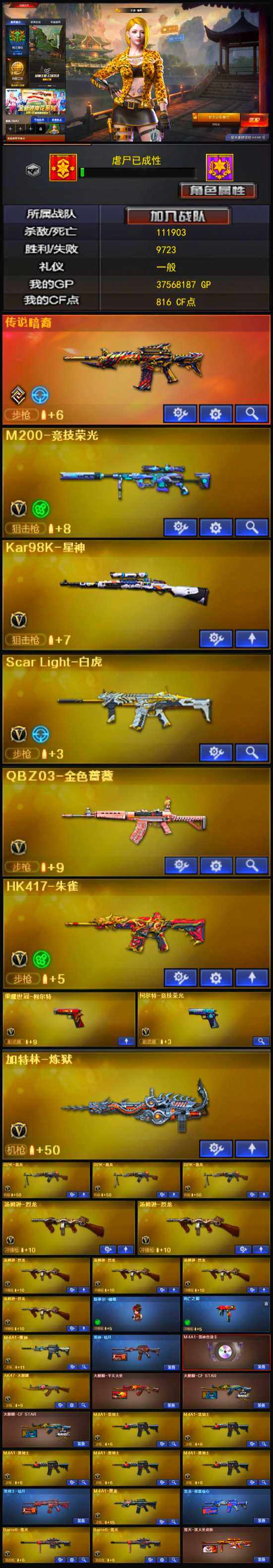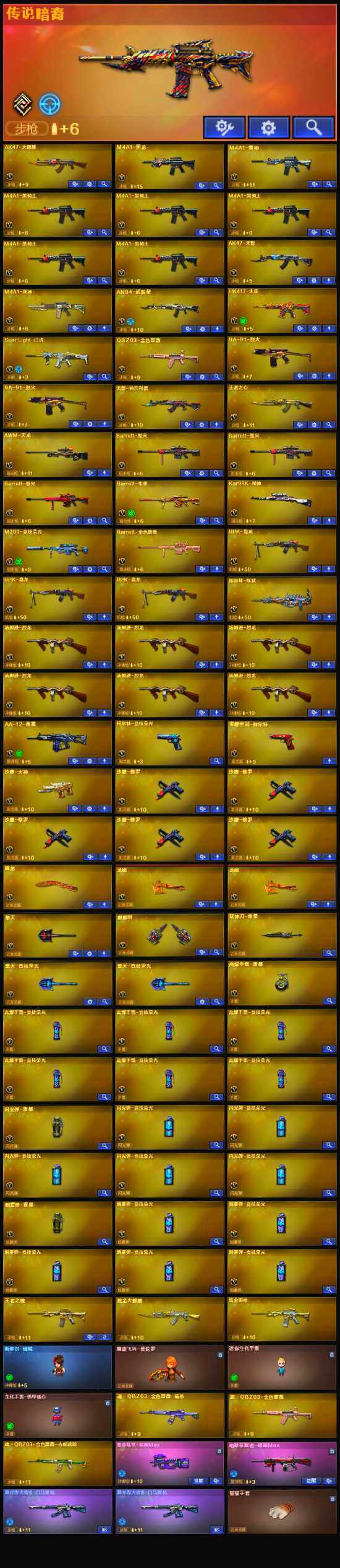 【热门武器】:传说暗裔,QBZ03-金色蔷薇,Scar Light-白虎,HK417-朱雀,M200-竞技荣光,死亡之眼,荣耀世冠-柯尔特,Kar98K-星神,M4A1-黑骑士*5,汤姆逊-烈龙*6,RPK-盘龙*3,加特林-炼狱,斯泰尔-蝴蝶,沙鹰-修罗*5