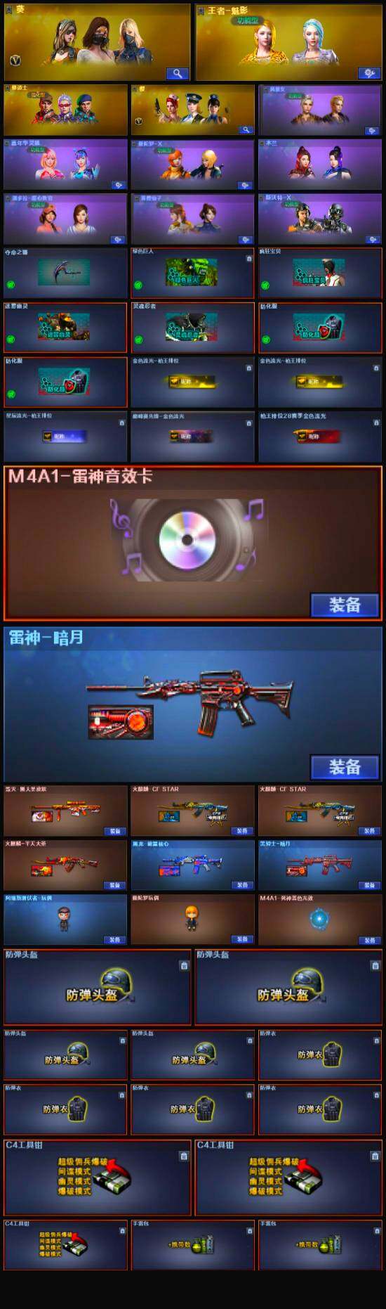 【英雄级武器】:M200-竞技荣光,柯尔特-竞技荣光,擎天-竞技荣光*2,高爆手雷-竞技荣光*6,烟雾弹-竞技荣光*5,闪光弹-竞技荣光*5,斩神刀-雷暴,荣耀世冠-柯尔特,QBZ03-金色蔷薇,Scar Light-白虎,HK417-朱雀,无影-神兵利器,M4A1-雷神,M4A1-黑龙,M4A1-黑骑士*5,M4A1-死神,RPK-盘龙*3,加特林-炼狱,汤姆逊-烈龙*6,AK47-无影,AK47-火麒麟,AN94-超新星,AWM-天龙,Barrett-毁灭*2,Barrett-极光,AA-12-雷霆,Kar98K-星神,Barrett-朱雀,M4A1-赤狱骑士,沙鹰-天神,沙鹰-修罗*5,麒麟刺,擎天,龙啸*2,屠龙