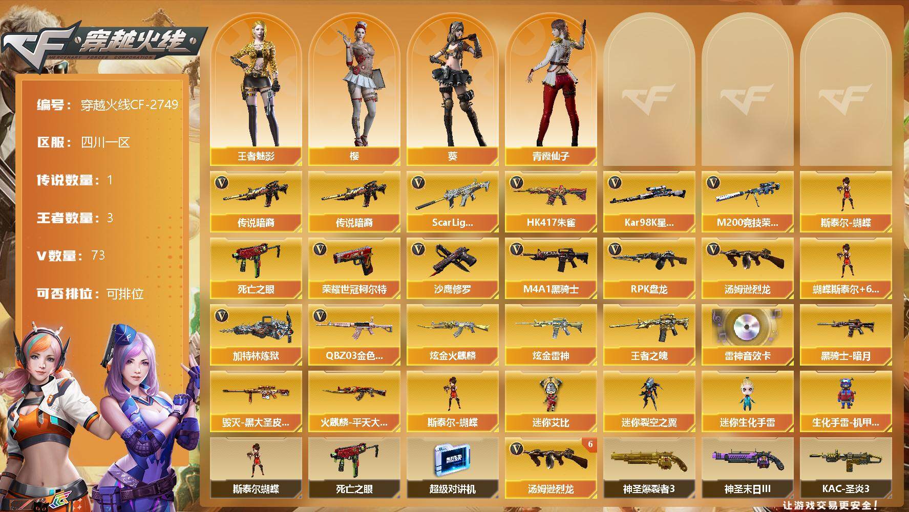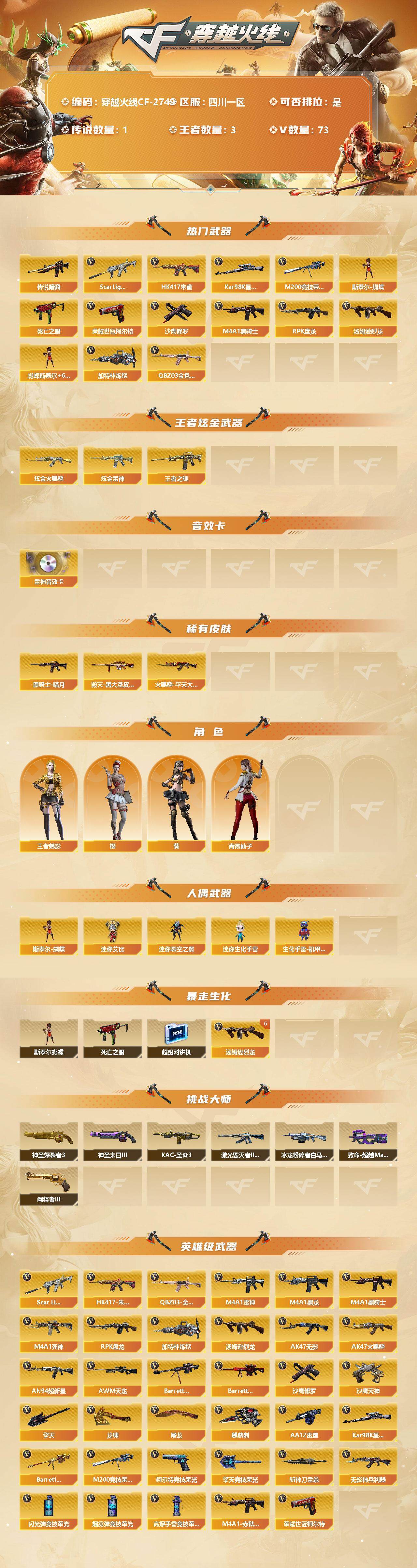 [12308946]【商品标题】:四川一区-73V-3王者-2炫金 【传说武器】:传说暗裔 【热门武器】:传说暗裔,QBZ03-金色蔷薇,Scar Light-白虎,HK417-朱雀,M200-竞技荣光,死亡之眼,荣耀世冠-柯尔特,Kar98K-星神,M4A1-黑骑士*5,汤姆逊-烈龙*6,RPK-盘龙*3,加特林-炼狱,斯泰尔-蝴蝶,沙鹰-修罗*5 【王者炫金武器】:炫金火麒麟,炫金雷神,王者之魄 【音效卡】:M4A1-雷神音效卡 【稀有皮肤】:火麒麟-平天大圣,黑骑士-暗月,毁灭-黑大圣皮肤 【角色】:王者-魅影,葵,樱,青霞仙子 【人偶武器】:斯泰尔-蝴蝶,迷你艾比,迷你裂空之翼*2,迷你生化手雷,生化手雷-机甲核心 【暴走生化】:斯泰尔-蝴蝶,死亡之眼,超级对讲机 【挑战大师】:神圣爆裂者III,神圣爆裂者-末日III*2,KAC-圣炎切割者III,阐释者III,激光毁灭者III-白马银枪*2,冰龙粉碎者-白马银枪*2,致命乱世-超越Max 【英雄级武器】:M200-竞技荣光,柯尔特-竞技荣光,擎天-竞技荣光*2,高爆手雷-竞技荣光*6,烟雾弹-竞技荣光*5,闪光弹-竞技荣光*5,斩神刀-雷暴,荣耀世冠-柯尔特,QBZ03-金色蔷薇,Scar Light-白虎,HK417-朱雀,无影-神兵利器,M4A1-雷神,M4A1-黑龙,M4A1-黑骑士*5,M4A1-死神,RPK-盘龙*3,加特林-炼狱,汤姆逊-烈龙*6,AK47-无影,AK47-火麒麟,AN94-超新星,AWM-天龙,Barrett-毁灭*2,Barrett-极光,AA-12-雷霆,Kar98K-星神,Barrett-朱雀,M4A1-赤狱骑士,沙鹰-天神,沙鹰-修罗*5,麒麟刺,擎天,龙啸*2,屠龙 【特殊枪械】:蝴蝶斯泰尔+6烈龙,1白虎,5黑骑士,6烈龙,3盘龙,1炼狱,1蝴蝶斯泰尔