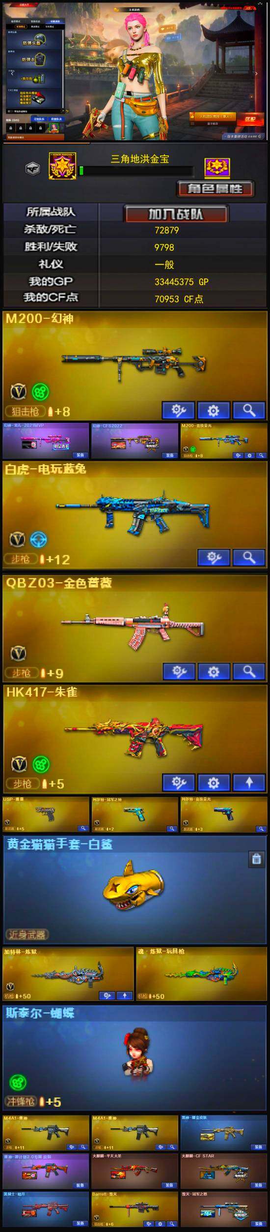 【热门武器】:QBZ03-金色蔷薇,HK417-朱雀,M200-幻神,M200-竞技荣光,白虎-电玩蓝兔,柯尔特-冠军之特,加特林-炼狱,斯泰尔-蝴蝶,USP-雷暴,黄金猫猫手套-白鲨