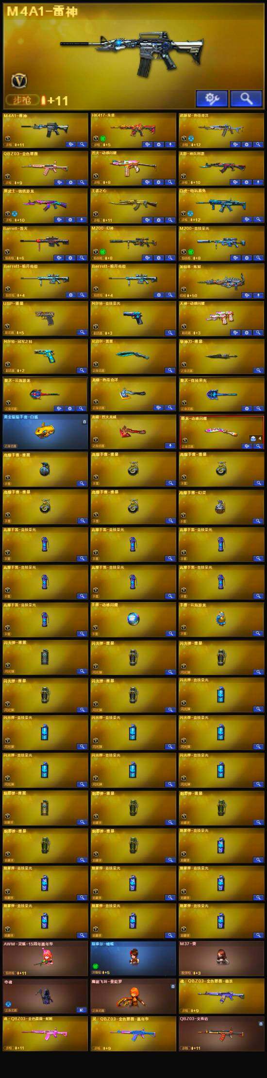 【英雄级武器】:M200-竞技荣光,柯尔特-竞技荣光,擎天-竞技荣光,高爆手雷-竞技荣光*7,烟雾弹-竞技荣光*7,闪光弹-竞技荣光*7,USP-雷暴,斩神刀-雷暴,烈火-动感闪耀,天神-动感闪耀,屠龙-动感闪耀,手雷-动感闪耀,QBZ03-金色蔷薇,HK417-朱雀,白虎-电玩蓝兔,无影-神兵利器,M4A1-雷神*2,加特林-炼狱,Barrett-毁灭,M200-幻神,黑武士-锦绣游龙,超新星-热带奇洋,AK-47-猩红传说*2,柯尔特-冠军之特,擎天-云海游龙,龙啸-热带奇洋