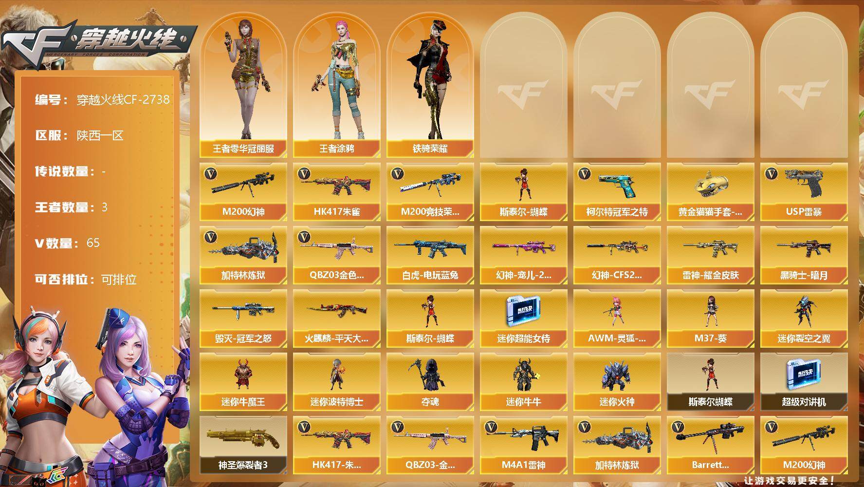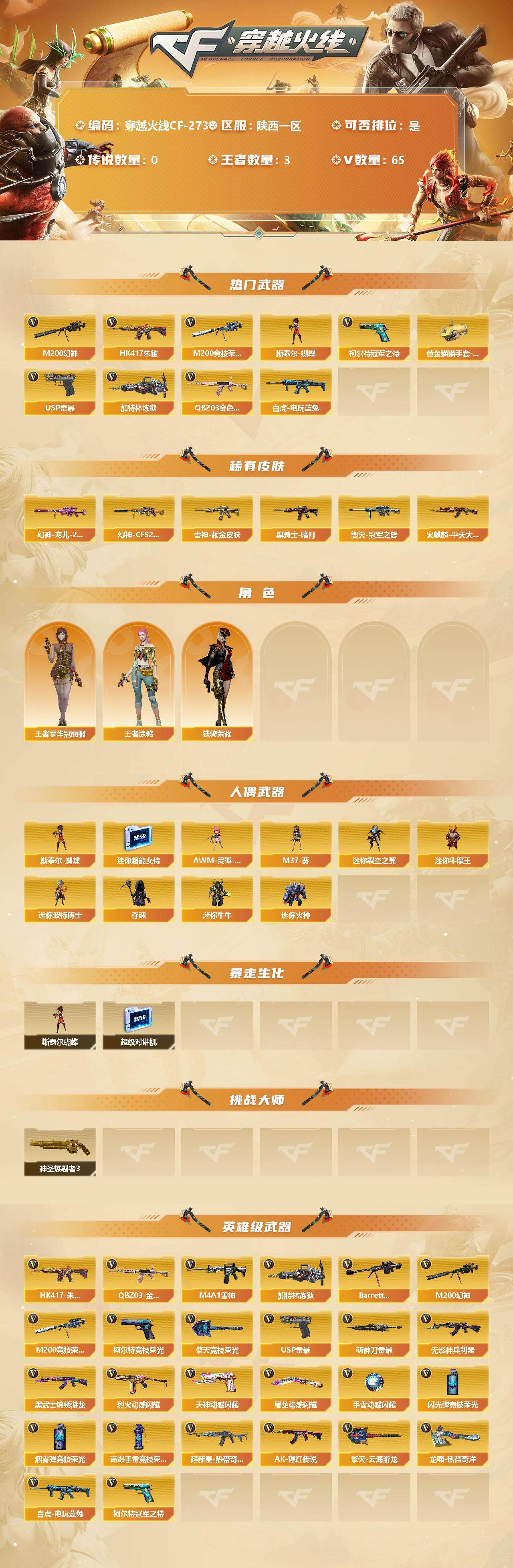 [12308873]【商品标题】:陕西一区-65V-3王者-0炫金 【热门武器】:QBZ03-金色蔷薇,HK417-朱雀,M200-幻神,M200-竞技荣光,白虎-电玩蓝兔,柯尔特-冠军之特,加特林-炼狱,斯泰尔-蝴蝶,USP-雷暴,黄金猫猫手套-白鲨 【稀有皮肤】:幻神-宠儿-2021MVP,幻神-CFS2022,雷神-耀金皮肤,火麒麟-平天大圣,黑骑士-暗月,毁灭-冠军之怒 【角色】:王者零-华冠丽服,王者涂鸦,铁骑荣耀 【人偶武器】:斯泰尔-蝴蝶,AWM-灵狐-15周年嘉年华,M37-葵,迷你超能女侍,迷你裂空之翼,迷你牛魔王,迷你波特博士,夺魂,迷你牛牛,迷你火种 【暴走生化】:斯泰尔-蝴蝶,超级对讲机 【挑战大师】:神圣爆裂者III*3 【英雄级武器】:M200-竞技荣光,柯尔特-竞技荣光,擎天-竞技荣光,高爆手雷-竞技荣光*7,烟雾弹-竞技荣光*7,闪光弹-竞技荣光*7,USP-雷暴,斩神刀-雷暴,烈火-动感闪耀,天神-动感闪耀,屠龙-动感闪耀,手雷-动感闪耀,QBZ03-金色蔷薇,HK417-朱雀,白虎-电玩蓝兔,无影-神兵利器,M4A1-雷神*2,加特林-炼狱,Barrett-毁灭,M200-幻神,黑武士-锦绣游龙,超新星-热带奇洋,AK-47-猩红传说*2,柯尔特-冠军之特,擎天-云海游龙,龙啸-热带奇洋 【特殊枪械】:蝴蝶斯泰尔+0烈龙,1炼狱,1蝴蝶斯泰尔