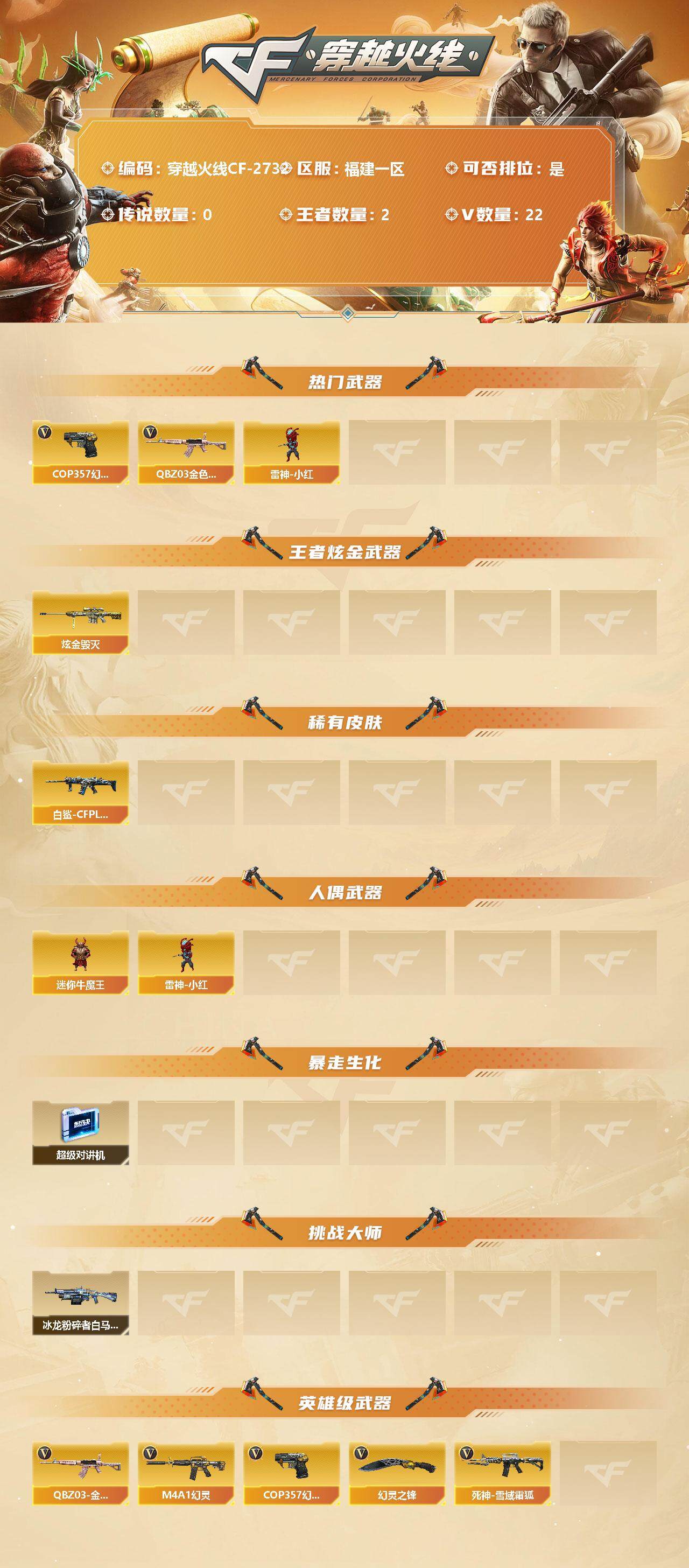 [12308824]【商品标题】:福建一区-22V-2王者-1炫金 【热门武器】:QBZ03-金色蔷薇,雷神-小红,COP 357-幻灵 【王者炫金武器】:炫金毁灭 【稀有皮肤】:白虎-白鲨-CFPLS23冠军 【人偶武器】:雷神-小红,迷你牛魔王 【暴走生化】:超级对讲机 【挑战大师】:冰龙粉碎者-白马银枪 【英雄级武器】:M4A1-幻灵,COP 357-幻灵,幻灵之锋,QBZ03-金色蔷薇,死神-雪域霜狐 【特殊枪械】:
