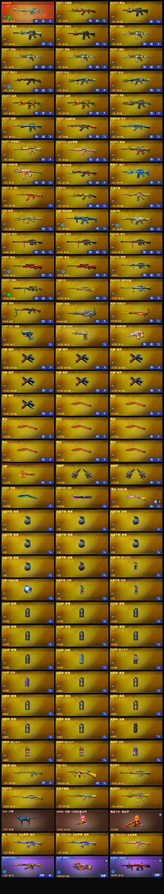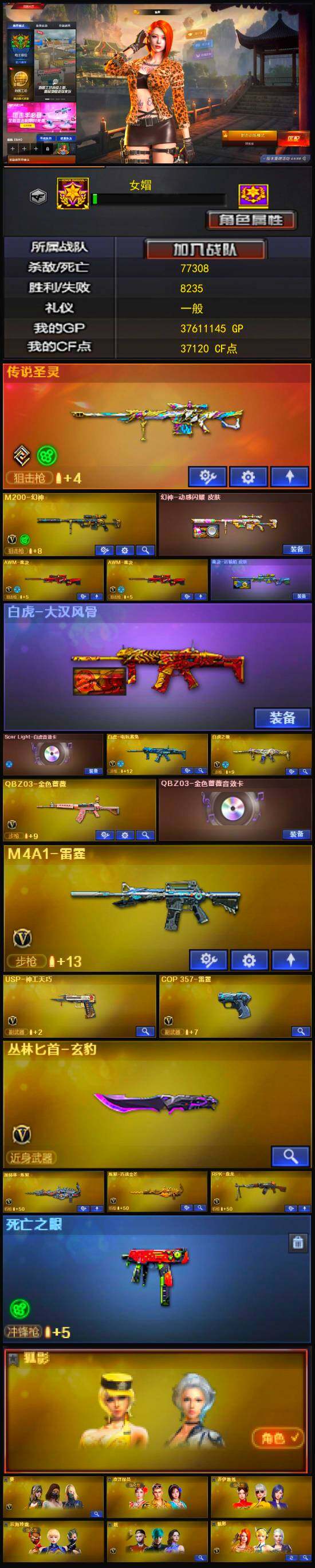 【热门武器】:传说圣灵,QBZ03-金色蔷薇,M200-幻神,死亡之眼,白虎-电玩蓝兔,Cat-刀锋,M4A1-黑骑士,RPK-盘龙,加特林-炼狱,羊驼玩偶,沙鹰-修罗*7