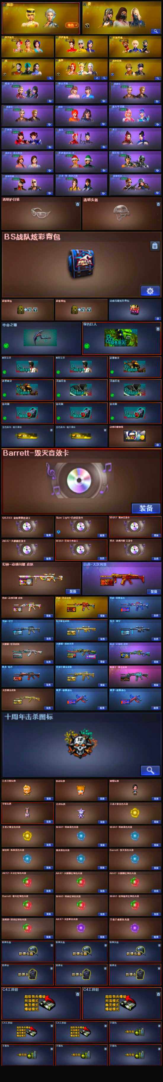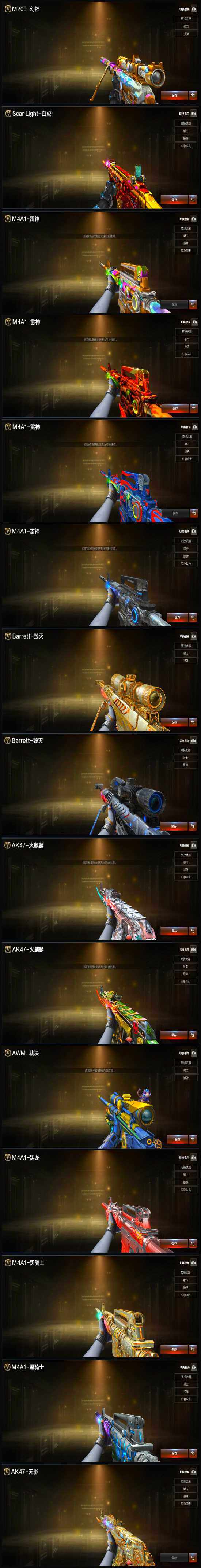 【英雄级武器】:USP-神工天巧,M4A1-雷霆,M4A1-武圣*2,烈火-动感闪耀,天神-动感闪耀,屠龙-动感闪耀,手雷-动感闪耀,QBZ03-金色蔷薇,白虎-电玩蓝兔,无影-神兵利器,M4A1-雷神,M4A1-黑龙,M4A1-玫瑰精灵,M4A1-黑骑士,M4A1-死神*4,RPK-盘龙,加特林-炼狱,AK47-火麒麟,AK47-黑武士,AK12-天启*2,Barrett-毁灭*3,AWM-裁决*2,M4A1-龙血,AK47-机械迷城,M200-幻神,M4A1-猎神,黑骑士-海王,AK-47-猩红传说*2,M4A1-赤狱骑士,沙鹰-修罗*7,麒麟刺*2,龙啸,屠龙*8