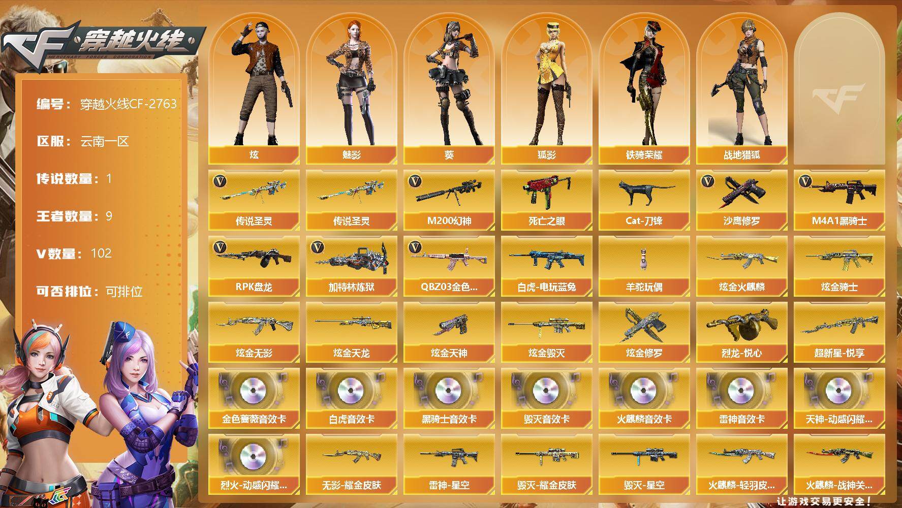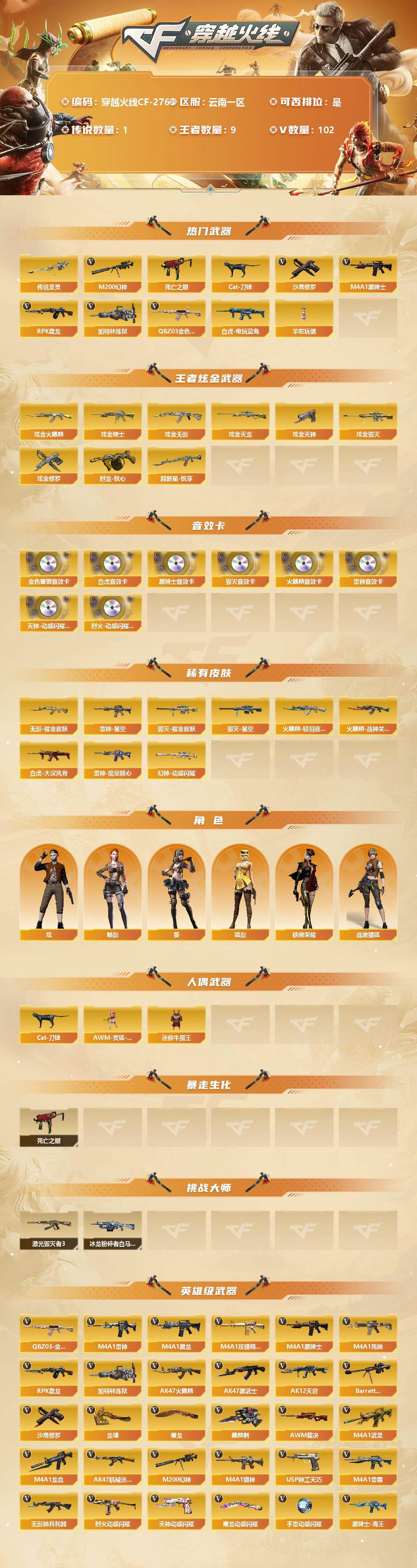 [12309005]【商品标题】:云南一区-102V-9王者-7炫金 【传说武器】:传说圣灵 【热门武器】:传说圣灵,QBZ03-金色蔷薇,M200-幻神,死亡之眼,白虎-电玩蓝兔,Cat-刀锋,M4A1-黑骑士,RPK-盘龙,加特林-炼狱,羊驼玩偶,沙鹰-修罗*7 【王者炫金武器】:炫金火麒麟,炫金骑士,炫金无影,炫金天龙,炫金天神,炫金毁灭,炫金修罗,烈龙-悦心,超新星-悦享 【音效卡】:天神-动感闪耀 音效卡*2,烈火-动感闪耀 音效卡,AK47-火麒麟音效卡,M4A1-雷神音效卡,M4A1-黑骑士音效卡,Barrett-毁灭音效卡,QBZ03-金色蔷薇音效卡,Scar Light-白虎音效卡 【稀有皮肤】:幻神-动感闪耀 皮肤,白虎-大汉风骨,雷神-能量核心,雷神-星空,火麒麟-轻羽皮肤,火麒麟-战神关羽,毁灭耀金皮肤,毁灭-星空,无影耀金皮肤 【角色】:狐影,葵,魅影,炫,战地猎狐,铁骑荣耀 【人偶武器】:AWM-灵狐-15周年嘉年华,Cat-刀锋,迷你牛魔王 【暴走生化】:死亡之眼 【挑战大师】:激光毁灭者III,冰龙粉碎者-白马银枪 【英雄级武器】:USP-神工天巧,M4A1-雷霆,M4A1-武圣*2,烈火-动感闪耀,天神-动感闪耀,屠龙-动感闪耀,手雷-动感闪耀,QBZ03-金色蔷薇,白虎-电玩蓝兔,无影-神兵利器,M4A1-雷神,M4A1-黑龙,M4A1-玫瑰精灵,M4A1-黑骑士,M4A1-死神*4,RPK-盘龙,加特林-炼狱,AK47-火麒麟,AK47-黑武士,AK12-天启*2,Barrett-毁灭*3,AWM-裁决*2,M4A1-龙血,AK47-机械迷城,M200-幻神,M4A1-猎神,黑骑士-海王,AK-47-猩红传说*2,M4A1-赤狱骑士,沙鹰-修罗*7,麒麟刺*2,龙啸,屠龙*8 【特殊枪械】:1黑骑士,1盘龙,1炼狱