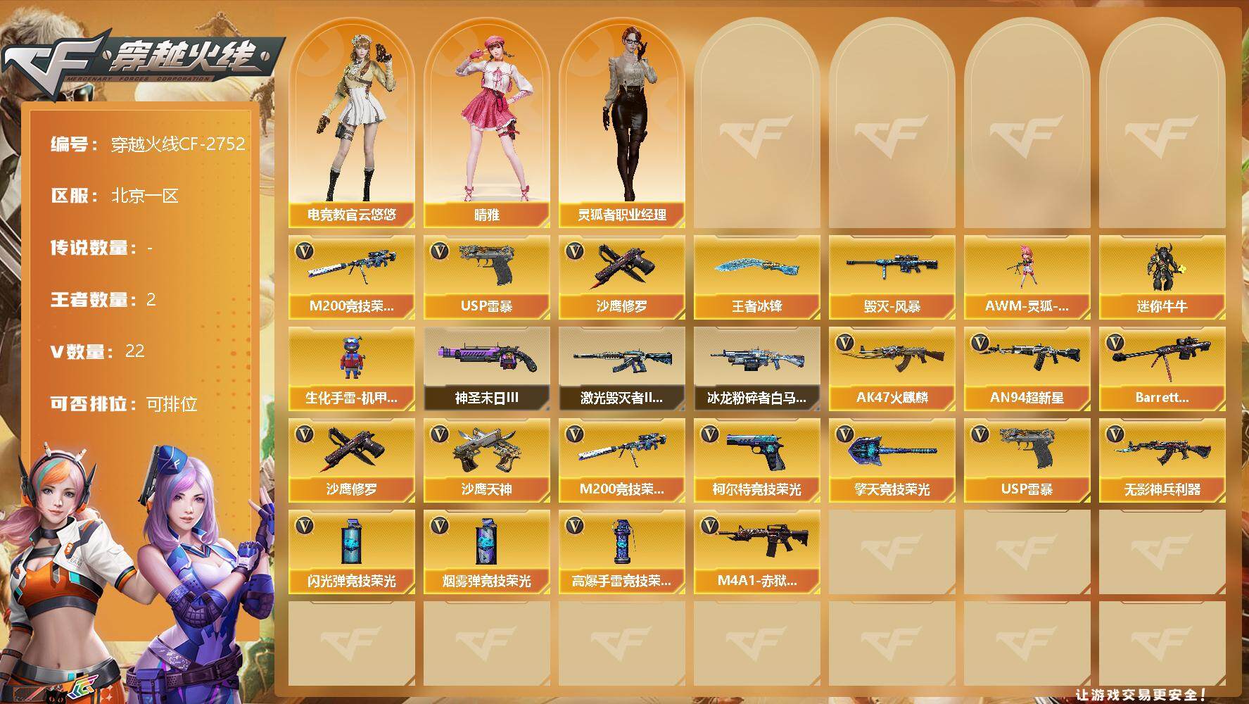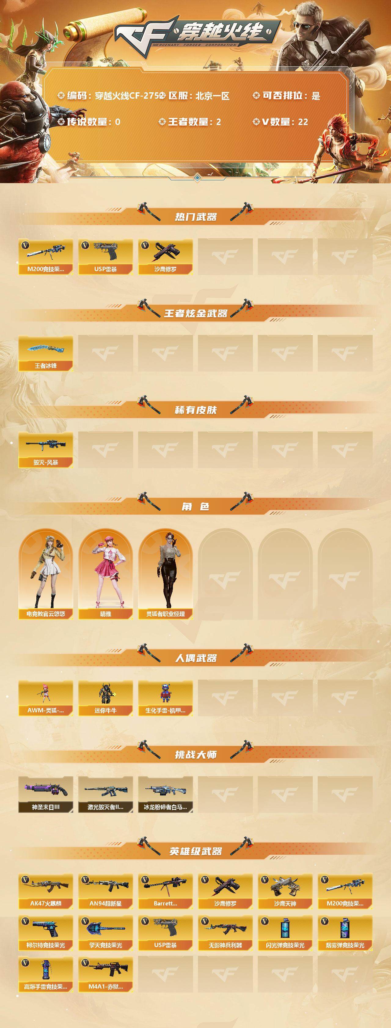 [12308960]【商品标题】:北京一区-22V-2王者-0炫金 【热门武器】:M200-竞技荣光,USP-雷暴,沙鹰-修罗*3 【王者炫金武器】:王者冰锋 【稀有皮肤】:毁灭-风暴 【角色】:灵狐者-职业经理,电竞教官-云悠悠,晴雅 【人偶武器】:AWM-灵狐-15周年嘉年华,迷你牛牛,生化手雷-机甲核心 【挑战大师】:神圣爆裂者-末日III,激光毁灭者III-白马银枪,冰龙粉碎者-白马银枪*3 【英雄级武器】:M200-竞技荣光,柯尔特-竞技荣光,擎天-竞技荣光,高爆手雷-竞技荣光*2,烟雾弹-竞技荣光*2,闪光弹-竞技荣光*2,USP-雷暴,无影-神兵利器,AK47-火麒麟*2,AN94-超新星,Barrett-毁灭,M4A1-赤狱骑士,沙鹰-天神,沙鹰-修罗*3 【特殊枪械】: